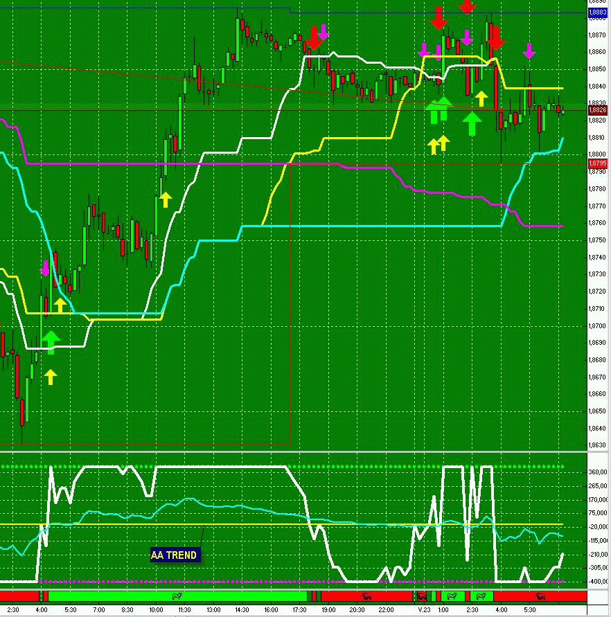 dzink dobře děláš, pivoty a určité překonávání jejich hranic je optimální cesta.. :)..je to něco jako Fibo u Vegase, jenže systém Vegas mi mnohdy evokuje čekání na Godota.. Sice nerad.. :), ale trochu to osvětlím..používám v základu tři věci: Plovoucí pivoty (PP) v periodě 25,50,100 a 200, hladinové trendy a pochopitelně mé milované fundamenty.:) Na grafu jsou plovoucí pivoty v pořadí period bílá, žlutá, modrá, fialová, které vytváří průběžně určité hranice vstupu. Je to kombinováno s ukazatelem trendu (graf dole)..když je bílá křivka stabilně nahoře (zelená hladina) je to Up, když dole (fialová hladina) Down. Modrá křivka je jen pro orientaci (CCI perioda 50). Hlídám (spíše to hlídá AOS) změny trendu (výkyvy bílé křivky z hladin Up a Down a její přechody přes X žlutou čáru) a kumuluji to se vstupy podle plovoucích pivotů. Obrovskou výhodou je i to, že ti hranice PP určí i možné další entry vstupy..Nic složitého, ale je to dost rentabilní a celkem i spolehlivé...viz včerejšek u cable..(ještě daleko lepší to bylo u JPY a franku)..dnes se to po nočním Tokiu jen motá a motá...Díky PP a hladinovým trendům může člověk celkem slušně i odhadnout hranice, kde a jak bude trh reagovat.. Snad jsem ukojil tvou zvědavost.. :) SID