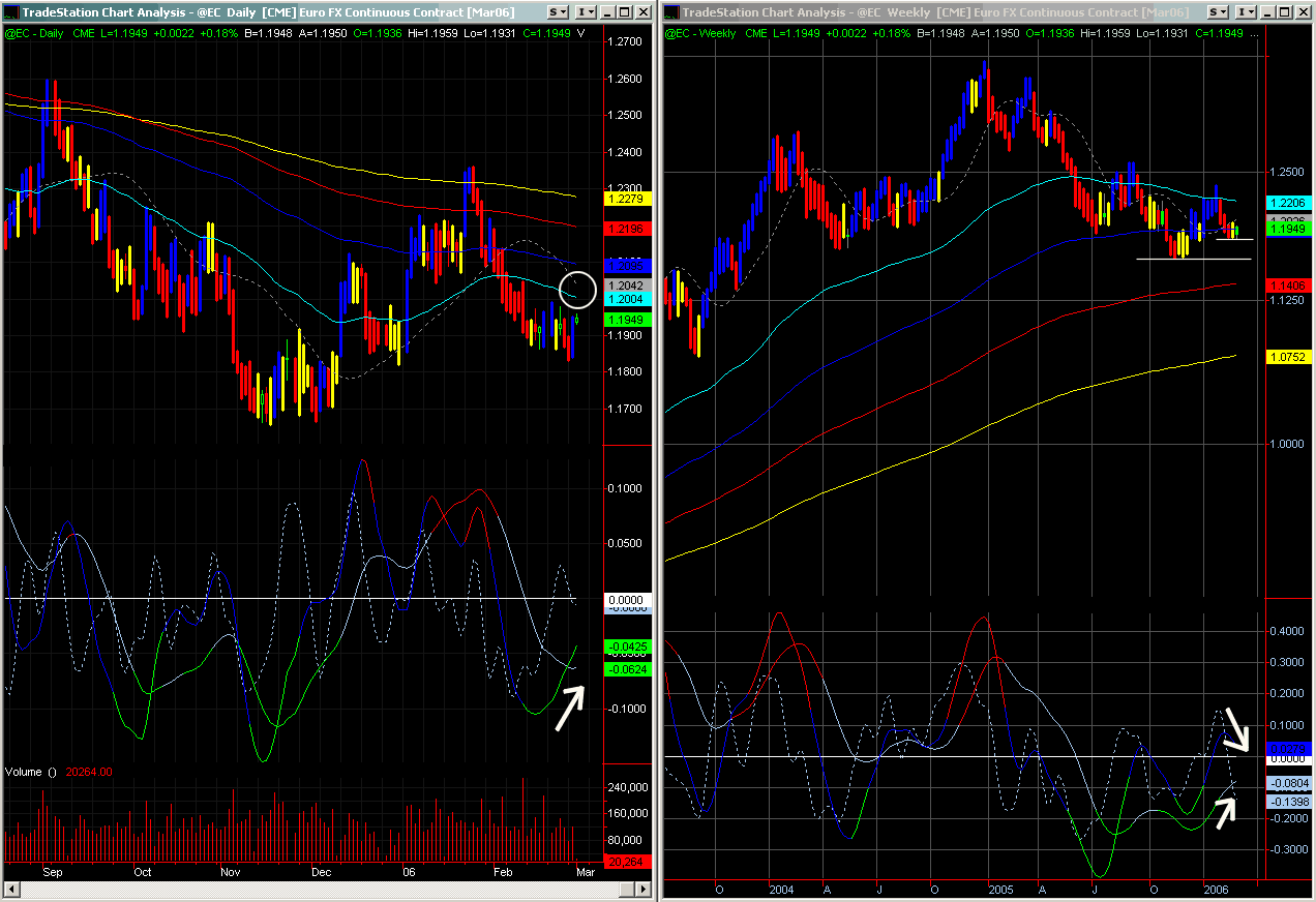 Marku, když mluvíš o trendu, vždy uváděj, na jakém grafu ho vidíš, protože to co je uptrendem na 1min grafu, může být ve skutečnosti jen retrace v downtrendu na daily grafu :-) Už jsem to psal, že vidím euro pozitivně, stále jsme nad 60 min křivkou a longové stále tlačí, je vidět velký nákupní apetit. Je podle mne jen otázkou času, kdy to longaři definitivně vyhrajou. Nicméně stále není vyhráno, jukni na daily a weekly graf. Daily má pěkný setup na longa, nicméně weekly to ještě tlačí dolů, nijak výrazně, ale trochu ano. Všimni si jedné věci. Je poměrně důležité, aby tento týden, nejlépe dnes nebo zítra došlo k proražení a udržení se definitivně nad hranicí 1.2, nejlépe někde kolem 1.2050. Osobně si myslím, že k tomu dojde, maximálně budeme nějakou dobu o tuto hranici narážet. Investoři přestávají dolaru věřit a čím dál víc zaznívají rizika pro dolar i mezi "běžnými" investory. Pokud dneska zavřeme nad 1.2, bude daily graf long, to už jsem psal, na grafu vidíš proč - všechny křivky půjdou nahoru a bude proražena rezistence daná světlemodrou křivkou. Rizika tedy stále trvají, protože jsme na daily pod všemi křivkami a je potřeba je mít neustále na zřeteli. Longové nemohou mít sílu věčně a pokud se nepodaří prorazit rezistence, budeme muset testovat některý ze supportů, to je základní poučka, která platí na všech intervalech grafů.