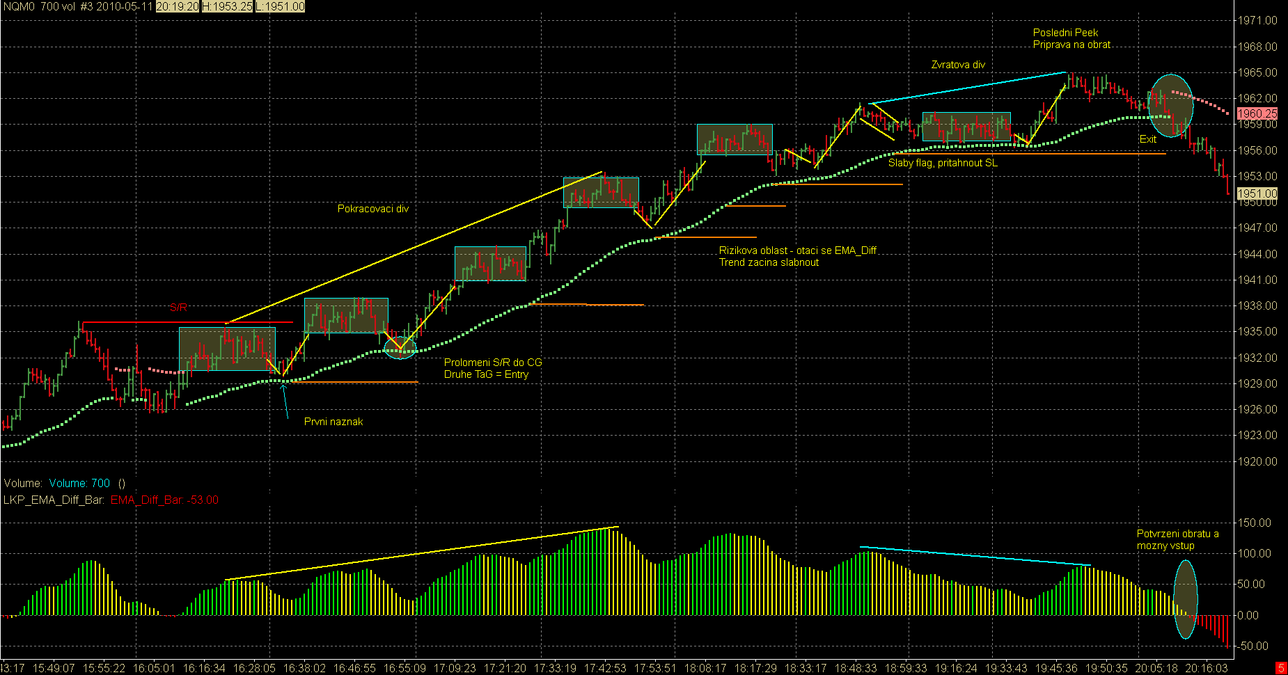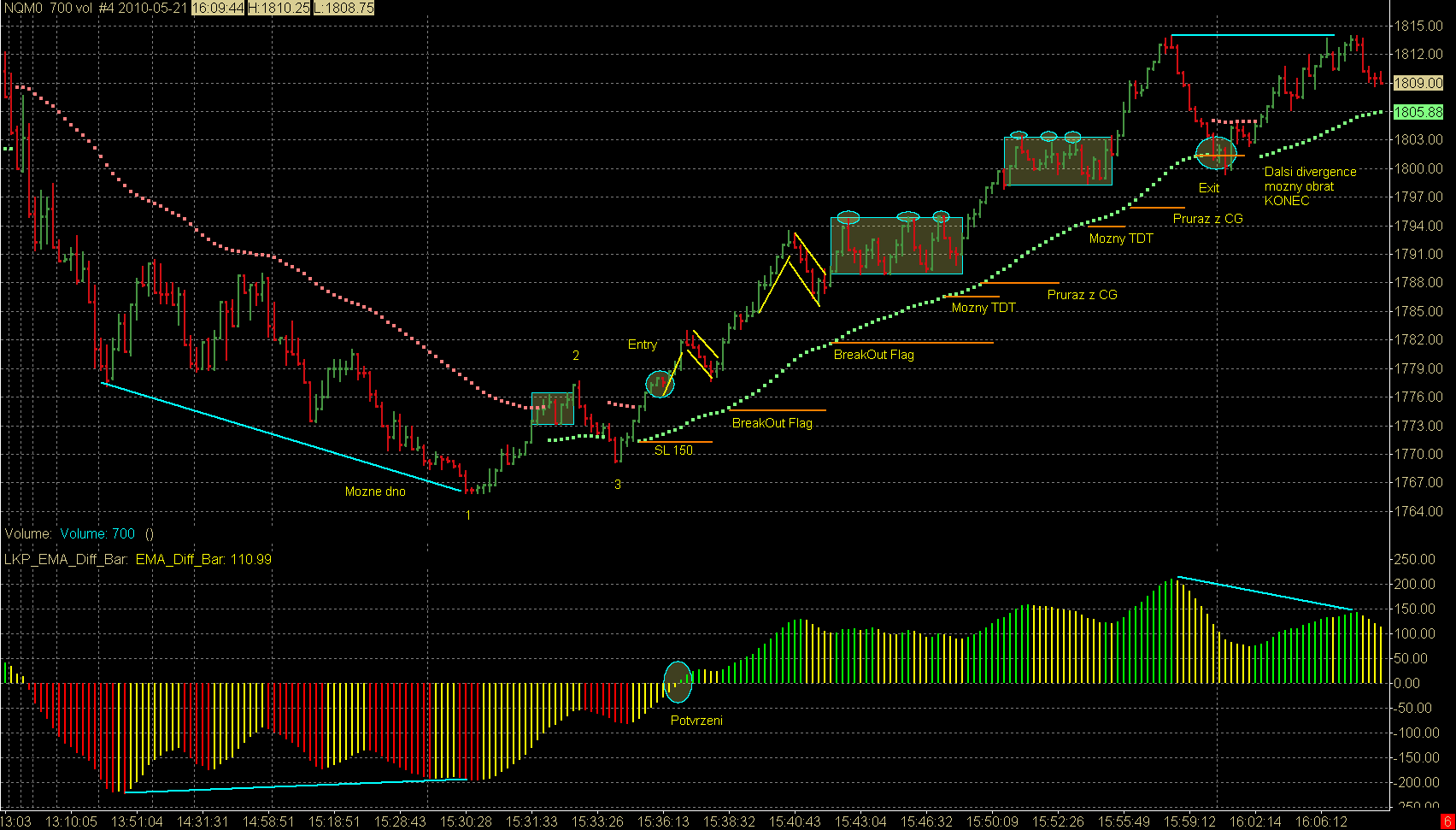2 JiM36 : No myslenku na NQ sem pojal hned jak se mi sice na TFku zobrazovalo vsechno korektne, akorat bodova stupnice vzala scale * 3... .coz bylo zacatkem minuleho tydne v obdobi "po velkem V" (6.5) :) (Notabene se NQ posledni dobou zabyvam i z jinych duvodu, takze to nebyl problem) Nechal jsem volume stejne jak predtim (pred "V"), jen graf jede o trochu rychleji nez by na muj vkus bylo zdravo, nicmene nechci zvysovat volume, protoze bych musel zvysovat SL. Presne tak... pohyby a vse okolo ted na NQ plnohodnotne zastupuji "drivejsi" TFko. Jen pohyby jsou nekdy trosku jine (vic svicek v CG apod) Btw: Ty si neobchodoval NQ ? Sem mel za to ze jo... no nic. Tak ja du neco delat. Mam taky na vikend o zabavu postarano ;) A aby si mel nad cim premyslet tak ti dam jeste jeden screen - to byl taky moc pekny den (nicmene sem ho neobchodoval) a podoba se to "vice mene" tvemu TaG, ale v provedeni NQ ;) Mej se, Pekny vikend vsem Rob