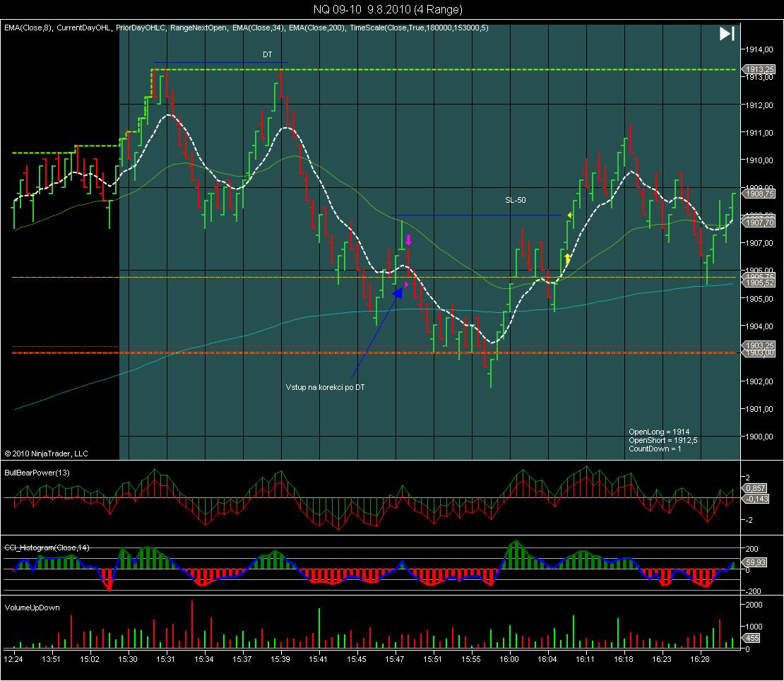 tak diskuze tady nějak vázne. Tak to zkusím nějak rozhýbat. Na to že jsou prázdniny, tak NQ se teď po open docela pěkně hýbe. Sice mi od začátku srpna utekl plný PT 300 USD už 2x o blbé 3 ticky a končil jsem tak na půlce na TSL, ale jinak si nemůžu vůbec stěžovat. Zatím úspěšnost kladných obchodů přes 75% a to rozhodně není normální. Uvidím, co se bude dít dále, snad se to bude takhle pěkně vlnit ještě nějakou dobu.