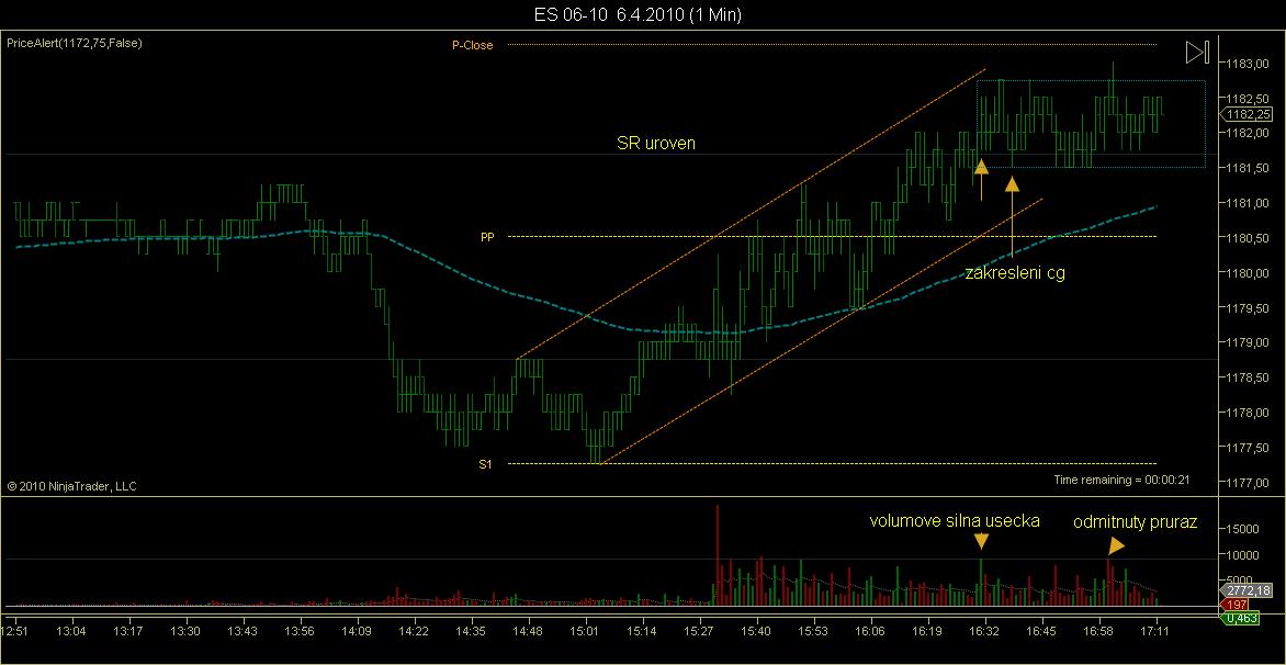 Jeden ze zpusobu, kterym identifikuju chop na sp500 je ten, ze se vytvori volumove silna usecka (vetsinou na nejake SR), pak se v jejim tele do strany vytvori dalsich 7-10 svicek, po tom zakreslim high a low tohoto congestion a v jeho ramci neberu zadne signaly (napr. DT, DB a 123, ktere v nem casto vznikaji a jsou vetsinou falesne. Tento priklad akorat ted na es. Od identifikace chopu se trh v jeho ramci pohybuje uz pres pul hodiny.