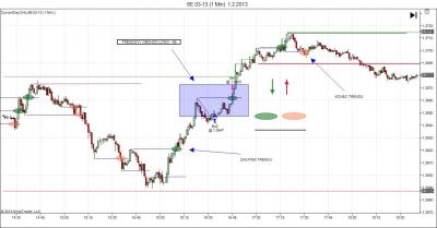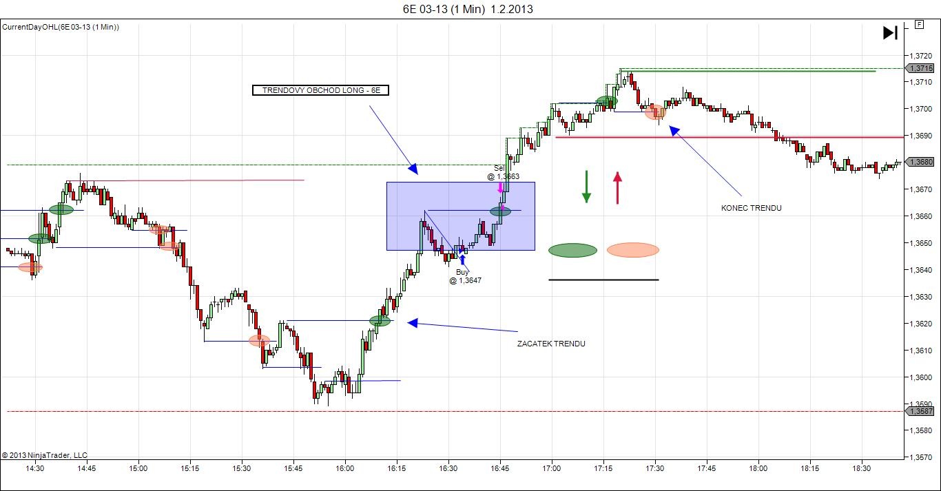 Honzo zaguglujte si / radeji v anglictine/ VNITRNI A VNEJSI USPORADANI/TRENDY/ TRHU. Je to dlouhodobe znama vec a neni to nic sloziteho. Obecne se trh sklada z hlavniho trendu /vnejsiho/ a vedlejsiho trendu /vnitrniho/. Ukolem tradera je najit takove vstupy, kdy jsou oba trendy v souladu. Tam kde je na obrazku naznaceno ukonceni /prulomm/, tak zde doslo k prurazu vnitrniho trendu zmena z LONG do SHORT , tedy ukonceni hledani signalu. Nehlede na to, ze v tomto case obchodovat 6E neni zrovna dobry napad. Obchodovat do trendu je mozne i v pripade, ze trh uz netvori nove highs nebo lows a cena se pohybuje uvnitr denniho rozpeti a naopak trend uz nemusi byt platny i kdyz se cena pohybuje kolem daily high/lows ....zde pote vznikaji platne DIV,DT,DB,HAS atd.