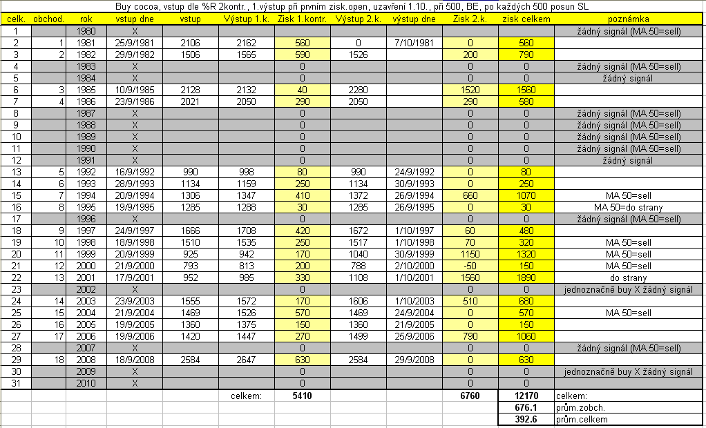 výstup z Lumber Medvědí trend stavebního dříví mi sice dělá radost, ale podle MRCI, dosáhl svého low. Problém je, že kromě mé zbabělosti (mám snahu sbalit výdlek a prchnout), nemám jedinou indicii proč z trendu odejít. Podle weekly TF. by mohl trend dojít k ceně 214,30 (nyní je na 216,50). To byl důvod proč jsem udělal další backtest na výstupy z trendu. Sloupec s datem obratu ukazuje na maximální low sezonního období. Ve sloupcích CCI je zapsán signál, který by mohl obrat signalizovat, většinou byl signál zpožděn o 2-4 dny, ale bez podstatných ztrát. Nejlépe vyšel signál na CCI-20, v případě obratu trendu šla křivka cci přes linku -100 směrem k severu ve 100%! CCI-50 nevydala signál pokaždé. Indikátor Williams %R byl ještě přesnější, ale ve dvou z 35 obratů selhal. Přesto ho beru vážně. Nakonec průměrný výstupný den, jsem ručně spočítal za 5,10,15,20 a 35 let. Tři léta z celkových třicetiosmi neberu u těchto výpočtů vpotaz, v tyto roky šlo o dominantní býčí trh a sezonnost nebyla vpodstatě naplněna. Na těchto průměrných dnech se potvrzuje můj dojem, že sezóna se posunuje směrem ke středu měsíce října (october). Dále podle sezonního pluginu TnT, dno ještě nenastává. tož, ať se nám daří, P