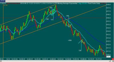 PO 23.8.2010 Dnes jsem byl utahanej jako kote ,takze jsem vubec nechtel obchodovat ,ale dal jsem slib. V patek byla prorazena hranice 600 bodu a na dnes nebyly oznameny zadne fundandamenty pouze v evrope ,ktere moc nedopadly. Jsem presvedcen ,ze medvedi buduji sve pozice ,jsem zvedavy jak bude moje predpoved pravdiva po mesici. prvni signal long jsem zmeskal protoze jsem si musel opet cist emaily tim hure ,ze by obchod dopadl ziskove, prvni vstup byl obchod v kanale protitrendove s tim ,ze pozici uzavru na jeho dolni trend line pokud nedojde rychle k jejimu prorazeni, bohuzel jsem do opbchodu vstoupil moc brzo, rozhodl jsem se pockat na dalsi validni signal po 16:00 SEC nicmene prisel o 36 vterin drive swing pod kanalem navic jeste pod pivotem. po diskusi s yax jsem si prostudoval sve zaznamy v excelu a vysly mi opravdu zajimava cisla 85% sance na profit 200$ podle toho jsem nastavil profit target - nemohl jsem urcit nejakou psychologickou hranici krome 600.0 bodu a na takove profity (cca +1400$/kontrakt) proste muj mozek neni pripraven tak jsem vystoupil s profitem +200$. takze jeste jednou diky to YAX. Dneska jsem proste nechtel ukoncit obchodovani beze ztraty ,ale s profitem. Dnesni obchodovani mi poprve pripadlo rutinni i kdyz mi trochu tlouklo srdce, ztrata , pockat na dalsi signal a vstoupit ,realizivat zisk, udelat si poznamky zaznamentat do sierrachart a cau. pozitiva: do druheho obchodu jsem vstoupil ,az kdyz opravdu prisel signal ke vstupu, i kdyz jsem mel nutkani vstoupit drive negativa: zmeskani prvniho mozneho obchodu, predcasny vstup do obchodu, pripravit sve mysleni na vetsi profity