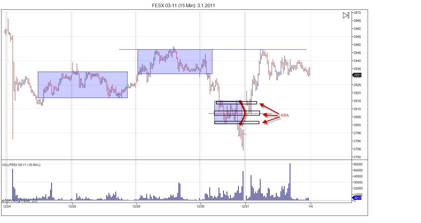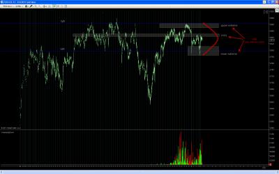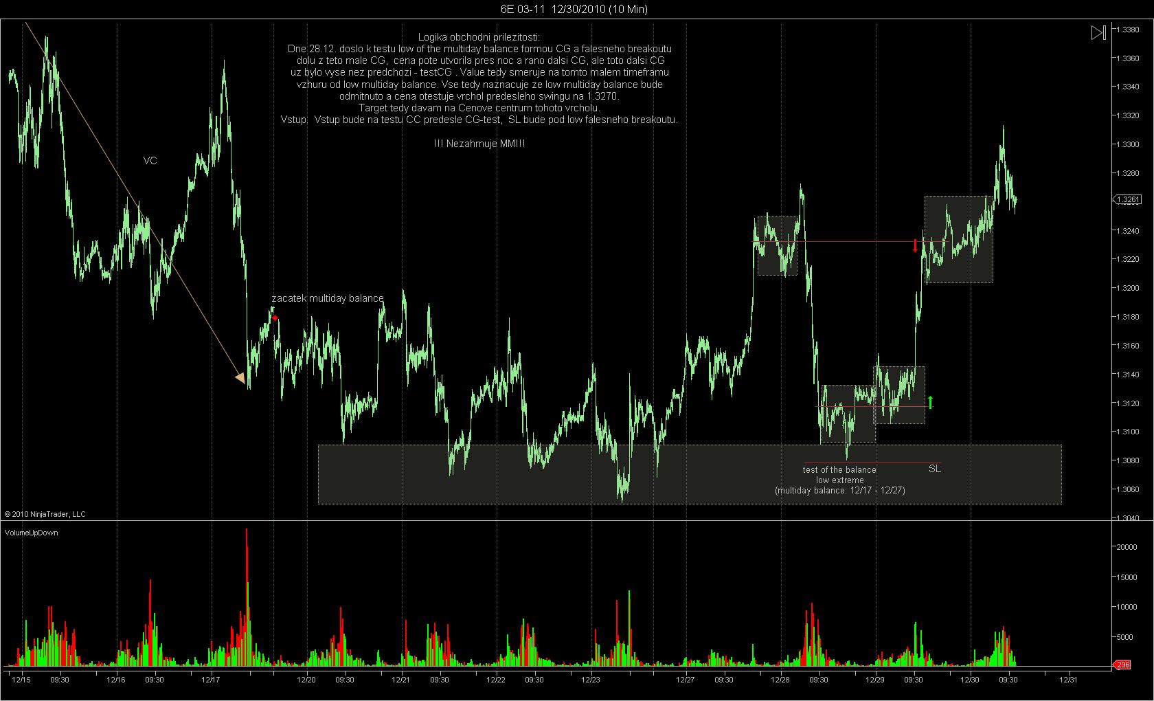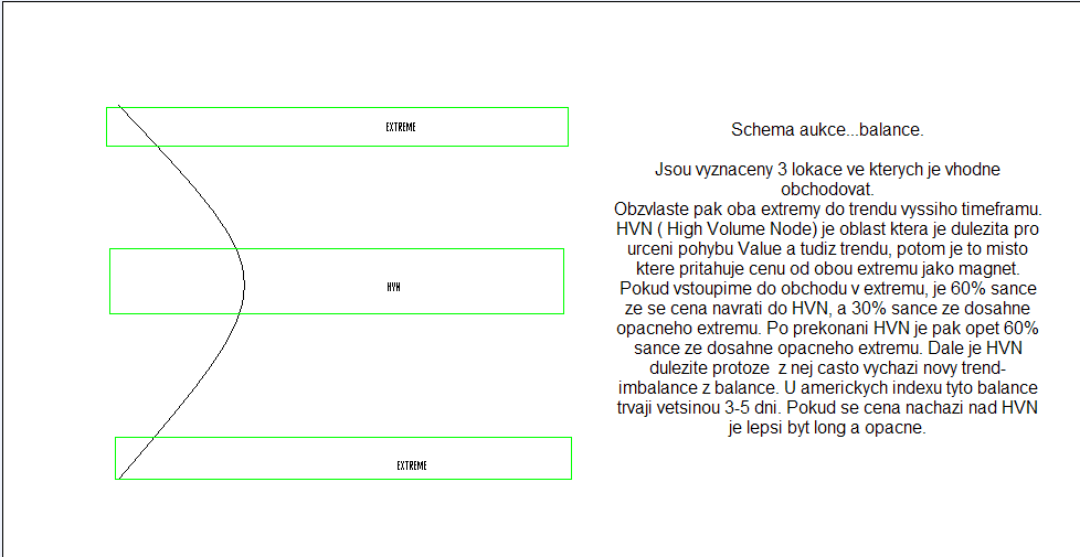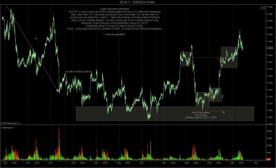 Dovolil jsem si vypujcit screen z vlakna Eurex a okomentovat jej, ponevadz pekne zapada do meho pojeti obchodovani. Nejprve na 60 min. grafu je pekne videt 3 KRA, cili mista zajmu, obzvlaste potom upper a lower extreme. Lower extreme je tvoren buing tails...cili cena dolu byla rychle odmitnuta a kupci velmi rychle zareagovali na nizkou cenu aby cenu okamzite vytrelili vyse. V tomto lower extremu je tudiz vyhodne nakupovat. Potiz muze ale delat SL, ponevadz by byl prilis daleko od low nejnizsich baru tvoricich buying tails. Obvykle SL davam pod lows buying tails. Moznost k obchodu se ale utvorila dalsi den po otevreni... Trh se porad nachazel ve spodni KRA, kde mam zajem nakupovat... Trh otevrel gapem (vertical conviction up) nad posledni mini balanci, kratce sel vzhuru, aby posleze otestoval HVN minibalance, ktera pusobi jako S/R. Pod tuto S/R dame SL, pokud jdeme long. Dulezite na tomto priklade je si vsimnout ze uvedeny princip: kupovat na lows balance, je zde sklouben na 2 urovnich- timeframe. Jde o konfluenci dvou timeframu, a je to mozne protoze Market aukce je fraktalni proces. V tomto prikladu se sice neutvorila perfektni minibalance na uplnem dnu vetsi balance, ale byl zde setup kdy trh breakoutoval nad minibalanci, pote otestoval HVN minibalance aby vzapeti sel vyse a to se odehralo uvnitr KRA vyssiho timeframu (lower extreme 60 min. balance); tudiz je zde moznost maleho SL s velkym potencialem, protoze PT davam s vyhledem na vetsi strukturu, tudiz 60min, HVN.