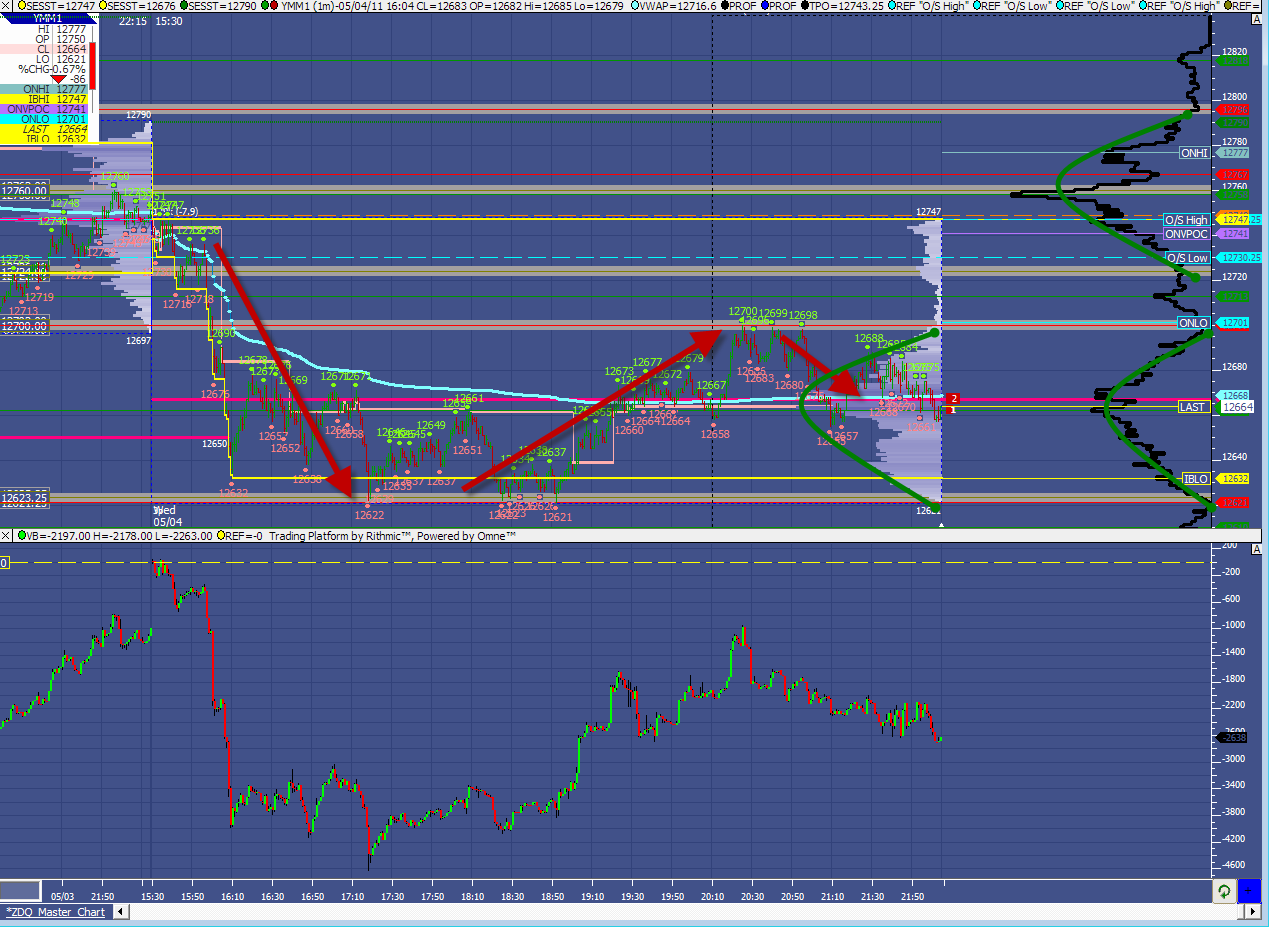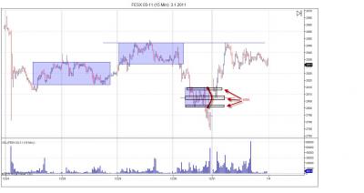 @yax (odpoviem do spravneho vlakna nech sa to nemiesa) Tak to mas pravdu, clovek si postupom casu vybuduje skutocne porozumenie trhom, nejde to lusknutim prstov ale je to pristup velmi robustny takze urcite za to stoji. Ja momentalne idem FESX, BUND, poobede ked mozem YM. So vstupom si nerobim starosti, ono to je tak ze ak je v mojej dopredu naplanovanej oblasti, prip sa vyvinie situacia o ktorej si myslim ze jej rozumiem staci mi impulz v dome v podstate reverzna sviecka na 1min grafe. Vystupy mam skalpersky fixny target all in all out a jedine ked obchodujem z vyznamnych urovni z profilu pridavam druhy scaleout a treti runner k targetu - napriklad ak mam odraz od CLVN tak target pre runner bude centrum balance area. Dnes z pohladu aukcie krasna akcia na vsetkych indexoch. V skratke break z vrchneho balance area do mensieho nizsieho, test spodnej CLVN, rotacia nahor, test vrchnej CLVN navrat do balance, na YM dnes VPOC suhlasi s high volume cenou kumulativneho profilu. Obchodoval som celu session, pocet obchodov radsej nenapisem niekto ma tu obvini z overtradingu. Dam sem screen aby vsetci videli ako prebiehala aukcia medzi levelmi. Uplne napravo mam kompozitny profil a sede urovne boli vyznacene pred session.