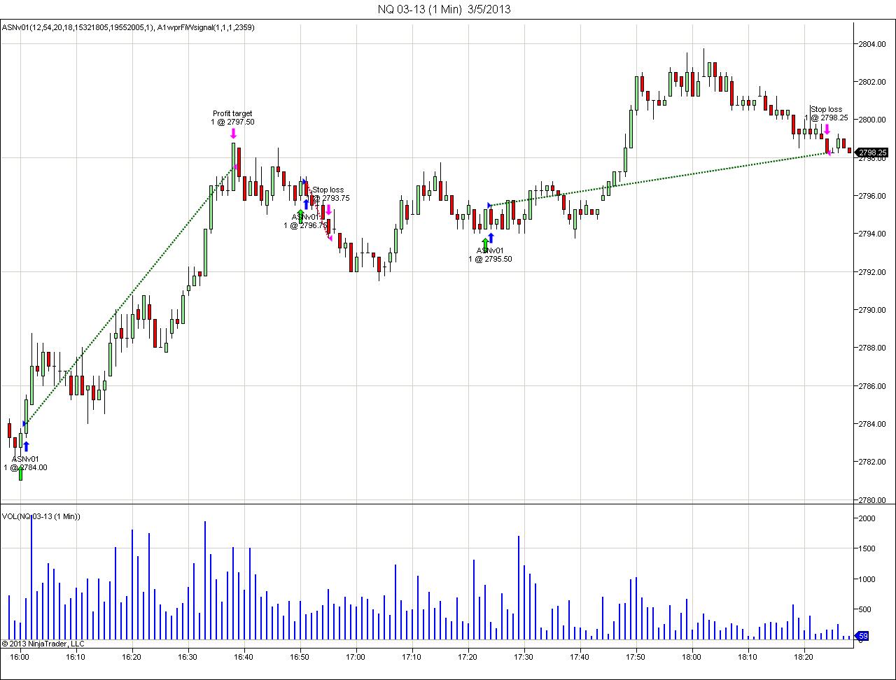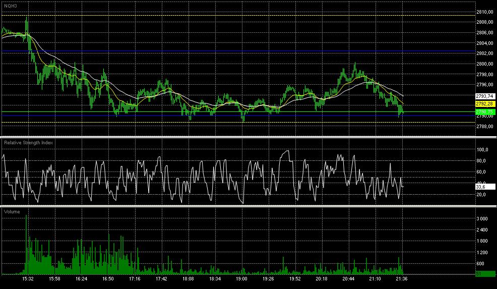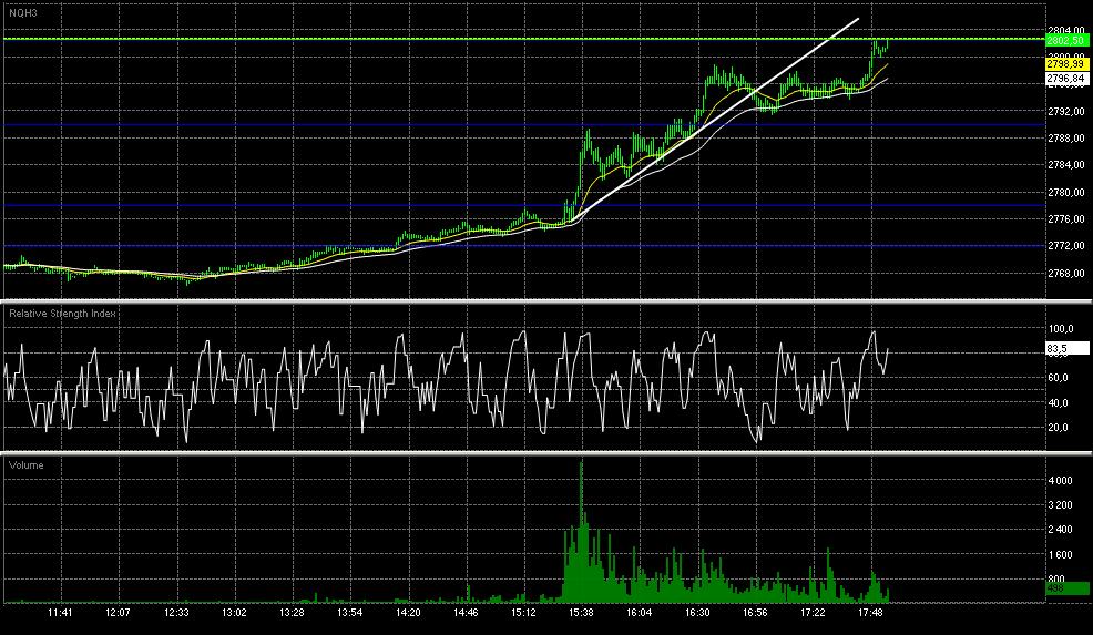 zřejmě už Nasdaq nikdo neobchoduje, že se tady nediskutuje, tak to dnes opět oživím:-) dnes se trh v pre-marketu opět obchodoval skoro jako vždycky v úzkém rozpětí, ale po 14. hodině velmi lehce překonal S/R 2772, což by mělo způsobit zabývat se myšlenkou, že bychom mohli jít long, v 16:00 mělo být vyhlášeno ISM Non-Manufacturing PMI a pak až do večera nic a to skoro vždy znamená, že trh nabere jeden směr a v tom by mohl pokračovat až do večera 15:35 jsem dostal signál jít long po uzavření býčí svíce 1 bod nad S/R 2778, bohužel to bylo příliš brzo, bál jsem se, že si trh jen tak dělá legraci krátce po otevření a láká mě do naskočení do longu, aby mi vymetl sl, nic jsem neudělal a jen koukal, jak trh velmi mocným pohybem míří k další S/R 2790, řekl jsem si, že naskočím opět 1 bod při uzavření nad touto úrovní, trh se ale vyčerpal a vytvořil 2 korekce, takovou malou micro S/R, při druhém dotyku jsem zakreslil bílou trendovou linku se začátkem na 2776, kterou pak trh respektoval a odrážel se od ní 16:29 uzavřela býčí svíce 1 bod nad S/R 2790, tak jsem tam skočil za market 2791,25 standardně plánuji pt 8 bodů, ale z minulosti jsem si pamatoval, že S/R 2802,50 je přímo magická, proto jsem nastavil pt na ni, bylo to 11,25 bodů, řekl jsem si, že to zkusím trh pak šel mým směrem, ale těsně před 2799 se zadrhl, aby se pak z otevřeného profitu 150 USD pohnul zpátky na 1 tick od mého vstupu, sl jsem neutahoval, věřil jsem svému obchodu při průrazu trendové linky jsem věřil, že trhu v cestě k mému sl stojí ještě S/R 2790, když se EMA20 začala hrozivě přibližovat EMA50, tak jsem začal být trochu netrpělivý, ale nakonec se trh po menší konsolidaci vydal ke S/R 2802,50 a v 17:50 ji pak o pár ticků prorazil, čímž mi nadělil pěkný profit USD 225 poučení z dnešního dne: obchodujte s trendem, pokud není porušen:-) věřte svým obchodním signálům v kombinaci se svojí intuicí neposunujte sl na BE:-)