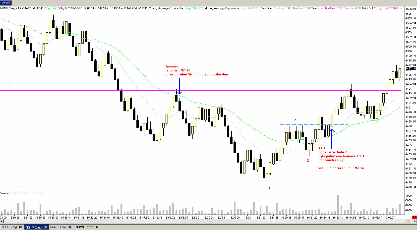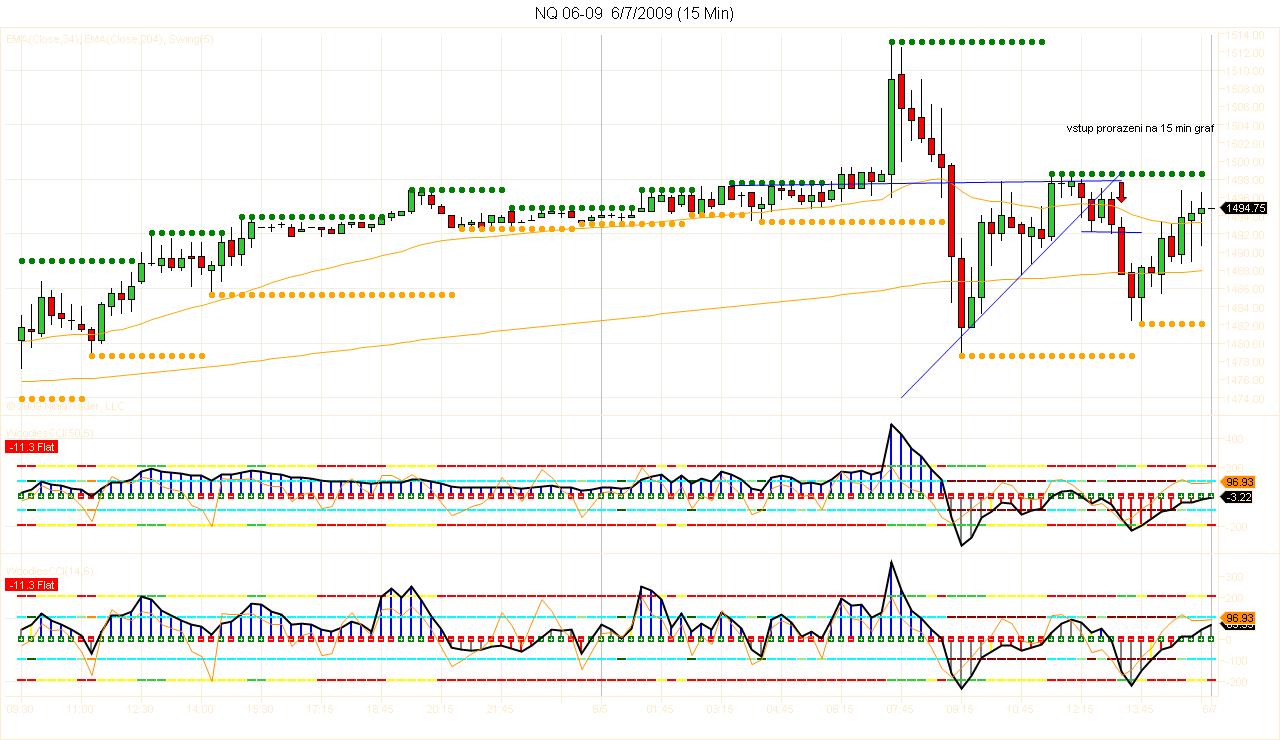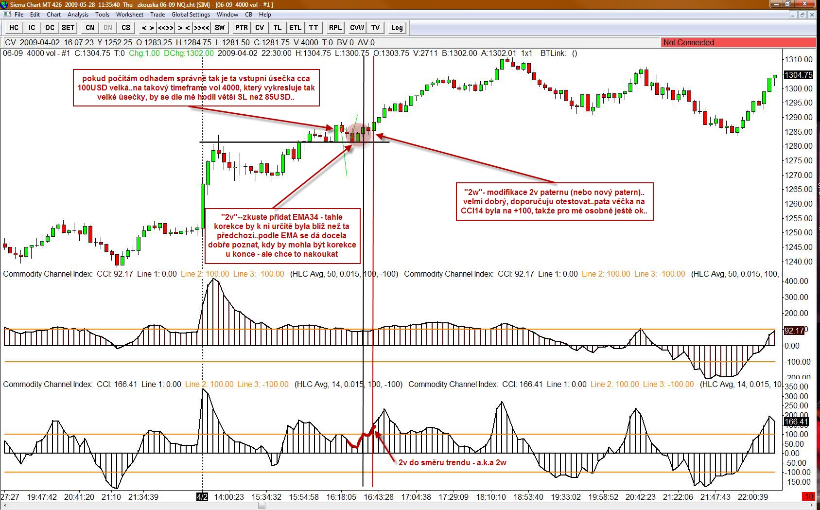 Tak ja obchoduju NQ live od listopadu 2008. Samozrejme jsem zazil vsechny zacatecnicke chyby a porad zazivam i kdyz lepsi se to :-) Obchoduju graf RB7 (35$). Je to docela rychle treba oproti Vol4000, kde by mi asi SL50, ktery pouzivam nestacil. Na druhou stranu cim rychlejsi graf, tim vic se dela vstupu a je nutno to filtrovat. Pouzivam klasicky EMA34 a EMA120 (vyzkousel jsem to EMA120 po vzoru jednoho tradera tady na foru a sedi mi to vic nez EMA204). Obchoduju jenom FinWin patterny a pouze do trendu spolu s kombinaci PA patternu (flip, DT, DB). SL50 mi vetsinou staci aby byl umisten pod swingem a nekdy ho mam tesne nad ale neresim to. Mam odzkousene, ze kdybych cekal na vstup limitnim prikazem tak, abych to mel vzdycky pod swingem tak mi hodne PT utece. Vstupuju prevezne STOP prikazem na close usecky, kdyz uz vidim do predu ze pattern se vykreslil.