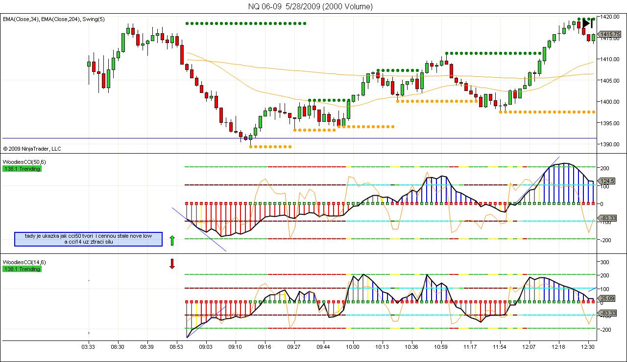 jeste jsem zapomel doplnit k tomu vystupu 1-2-3 ,ze to neni cisty vystup,vystoupil jsem hlavne proto protoze na druhem grafu mam znacene pivot points urovne a prave doslo k prorazeni hlavniho pivotu na urovni 1486.8333,ale vzapeti jak bylo videt na cci50 sla hned prvni svice zpet pres hlavni pivot a vlastne vytvorila bullish engulfing lines paterrn tak nebylo nac cekat.A za dalsi si mozna mnozi reknou proc pouzivam na vystup 1-2-3 na cci50 a ne na cci14?Na to jsem prisel nahodou pozorovanim,ze kolikrat kdyz uz nema cci14 silu tak i presto cci50 tvori nova maxima nebo minima a to zaroven s cennou,samozrejme je treba to brat jako doplnek,hlavni PT se ridim hlane pivotama a R/S urovnema.Prikladam graf ohledne rozdilnosti obou cci