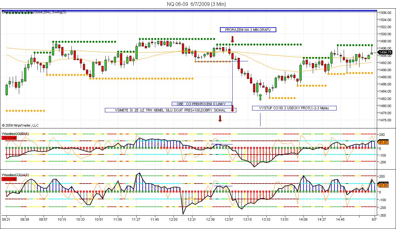 Diky vsem za prilozene screeny,taky tedy pridam jeden muj vydareny obchod z patku,kdyz uz se to tady rozjelo nez odjedu .Vstup a vystup je pouze zakreslen rucne,protoze obchody zadavam na druhem pc na jine platforme,ktera slouzi pouze na zadavani prikazu,je tedy bez indikatoru.Priste pridam nejaky neuspesny obchod,protoze na tom me aspon muzete poradit jakych chyb se dopoustim a o to me jde nejvice.Neni spatne ani dobre rady,kazda rada je necim uzitecna at uz pro me nebo pro nekoho jineho i kdybych si mel ze 100 rad,neboli spise ponauceni vybrat pro sebe jen jednu 1 tak je to uspech,protoze se zase posunu o krok dobredu,nebo me napadne zase jina myslenka jak se vyvarovat ztrate i kdyz system da signal v backtestu se ze stratou sice pocita,uspesnost je treba 40-50-60%,ale proc jeste treba to nejak nefiltrovat,necim co neni v systemu zahrnuto.Jde me treba o neco jako falesne prorazeni atd.. Takze prokladam 2 grafy jeden vyssi 15 min. na kterem sem videl vlajku a pote prorazeni a potom nizssi 3 min.na kterem ve stejnou dobu dochazelo k prekrizeni 0 linky na obou cci i trh uz na cci ztracel silu protoze uz nedokazal prekrocit hranici +100 predem dik za upozorneni na mozne chyby