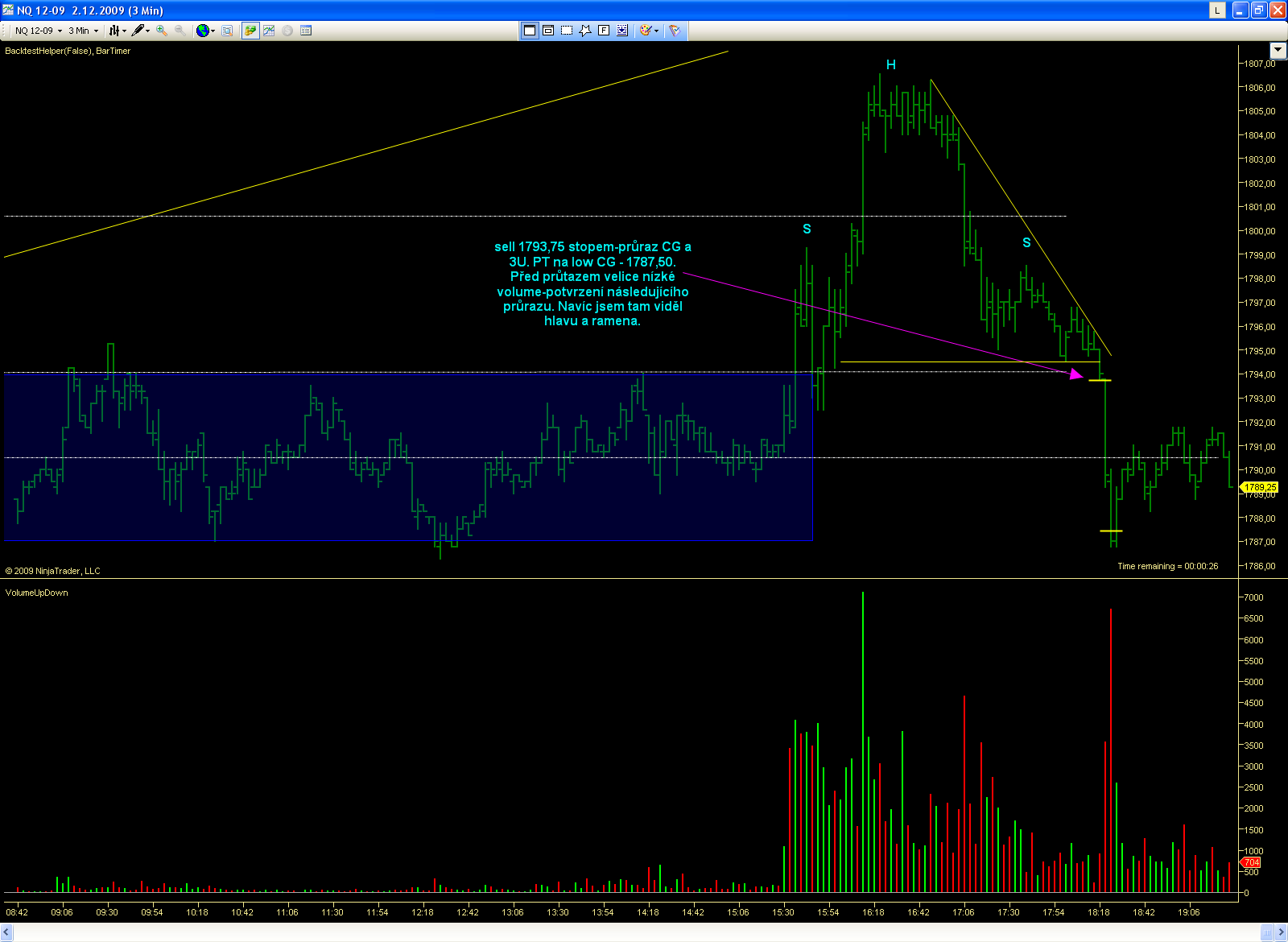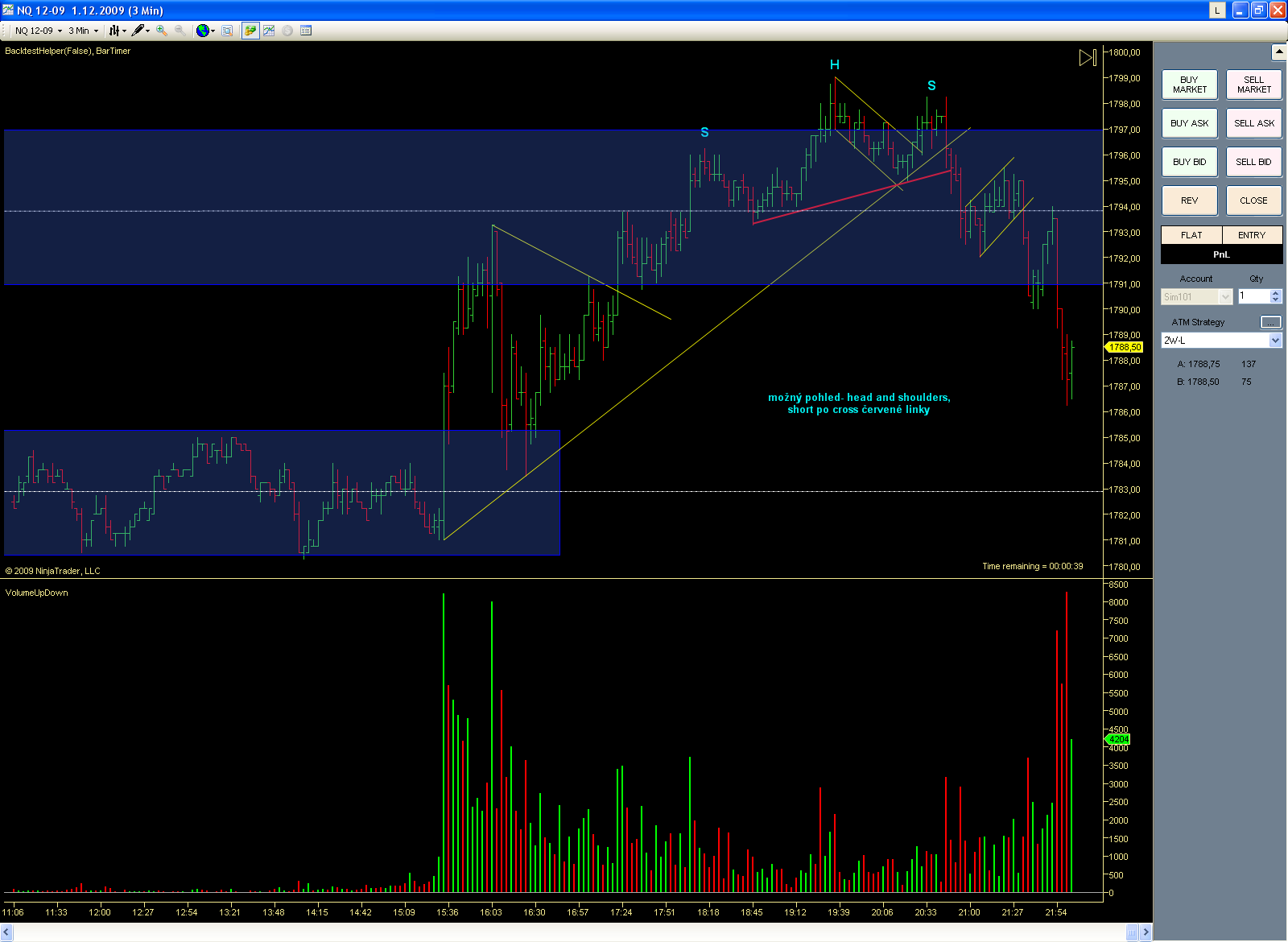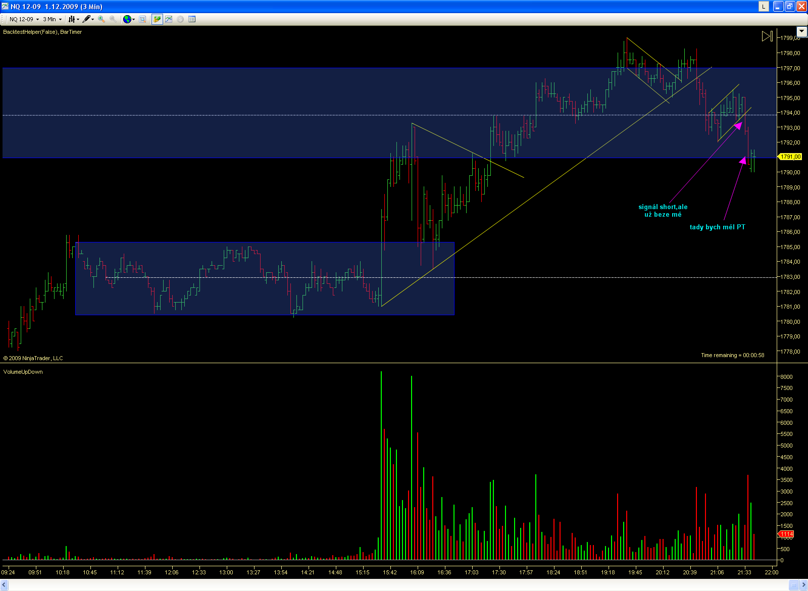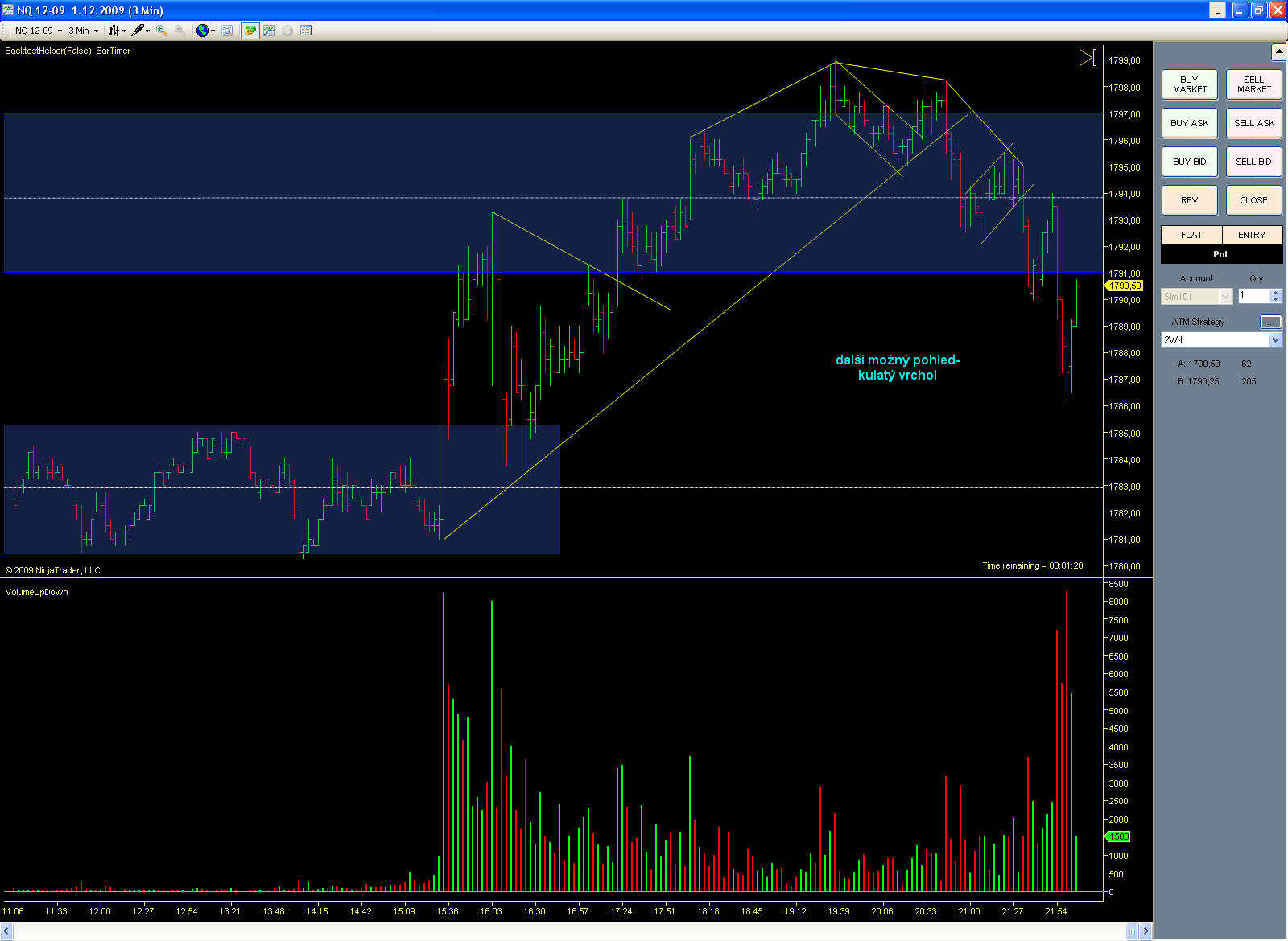 Dnes jsem vstoupil long. Po proražení high premarket a včerejším high jsem čekal na korekční křivku a vstup TTE. Dnes se vykreslila korekční křivka velice hezky, prostor k high byl vysoký. Vstup 1795,50 na průrazu korekční křivky. Pozice ale skončila na breaku. STP jsem posunul po proražení high open úsečky, což bylo 2,25 v plusu na pozici, následná korekce mě vymetla. Otázkou je, zda jsem STP přitáhl brzy nebo jsem ho přitáhl smysluplně? Popis i ve screenu.