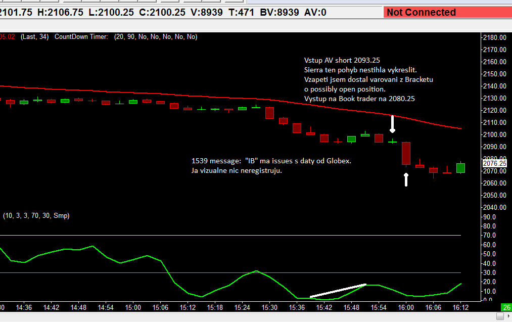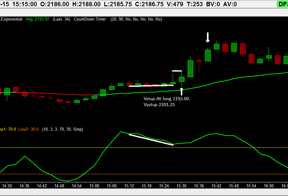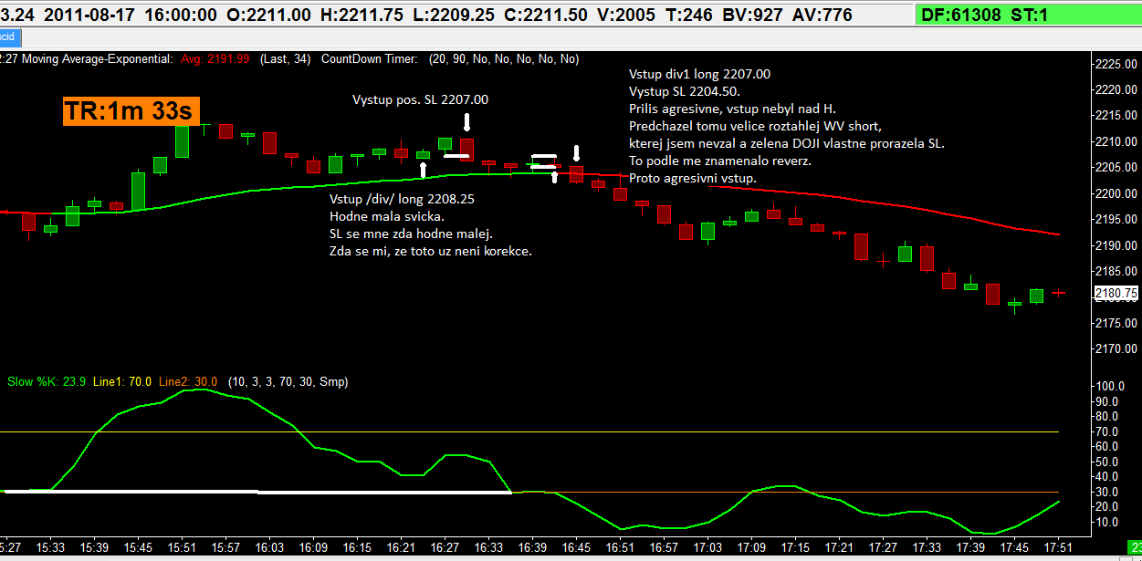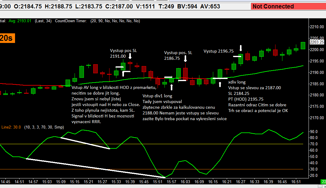 mikky182: Zajimavej system, vstupy taky pomerne jednoduche a jdes si pro vysoke RRR. Parada. Ne, nove okuliare zatim nemusis. Ono ne vsechny divergence musi byt tak evidentni :) xdiv je skryta divergence do trendu. DB tentokrat nebyl idealni, ale byl to uz 2. odraz takze takovej signal beru. K te sleve, ja nechci jit prilis do detailu, stalo me to trochu casu a pozorovani, ale nic sloziteho v tom neni. Vstupni svicka u obchodu #3 byla v 1615 (close 2187.50). ja jsem si pockal na lepsi plneni u nasledujici svicky a vstoupil za 2187.00. SL se tam nezmenil, ja ho davam pri tomto vstupu pod L vstupni svicky. Zdravim P.