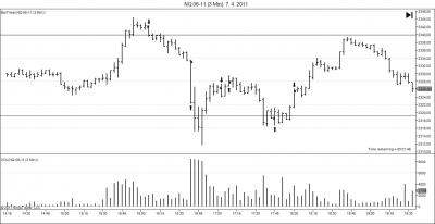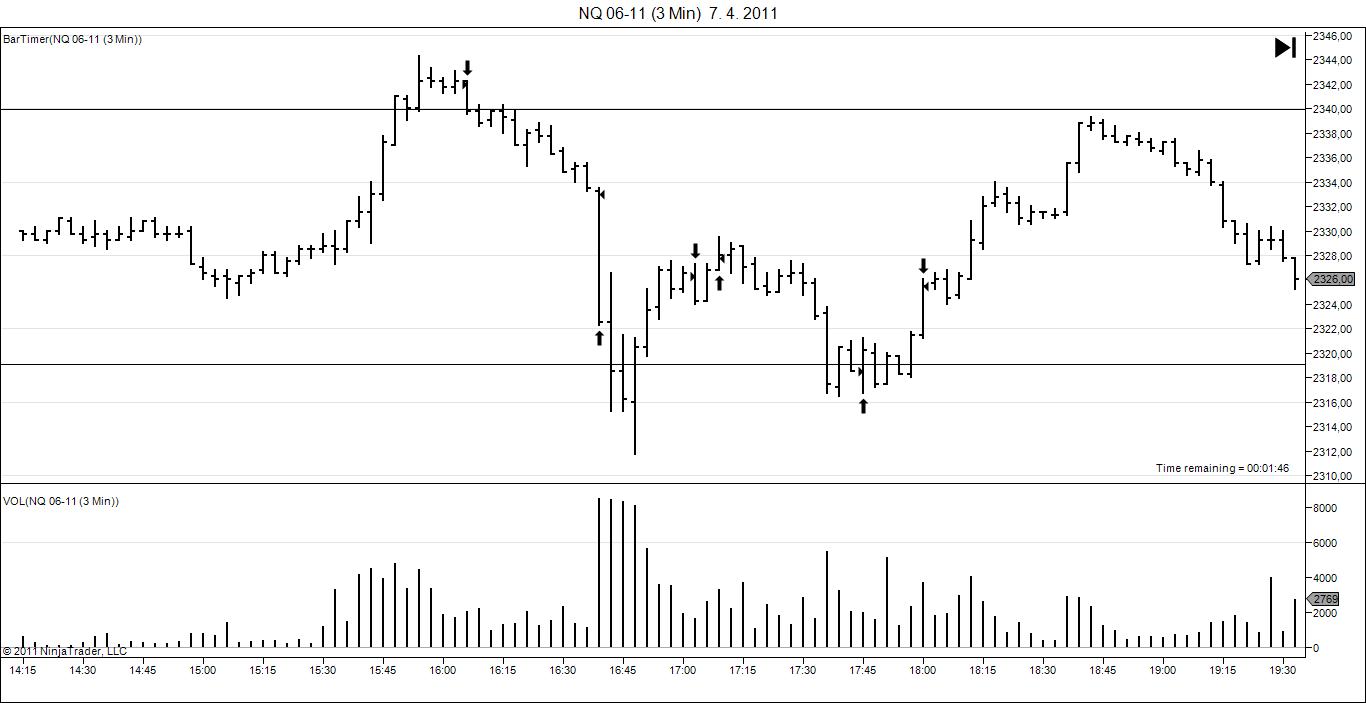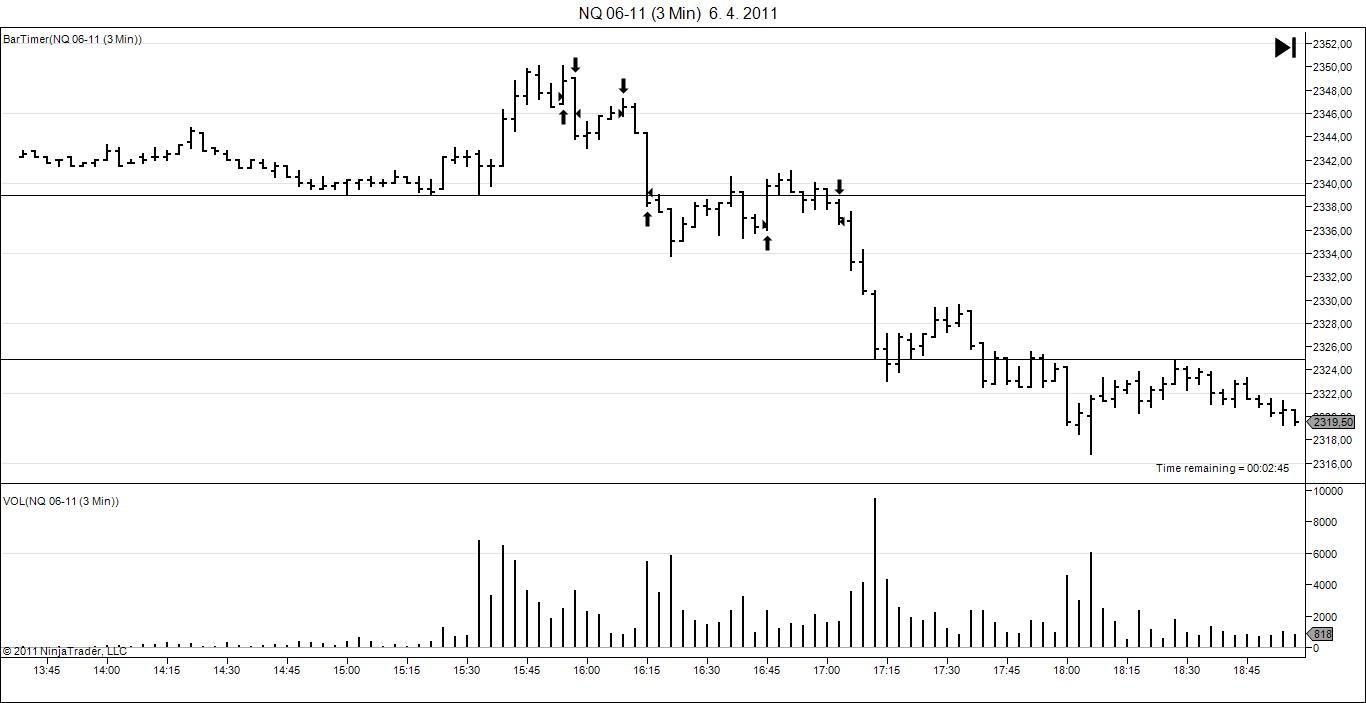 miles: z tykaním nieje žiaden problém len vzhľadom na vek vikám radšej všetkým:) Priložím screeny z minulého týždňa konkrétne streda a štvrtok. Boli to najziskovejšie dni ale to nieje dôvod prečo som ich vybral. Vidno tam či už protitrendové obchody ale aj tie trendové. Rovnako sú tam dve straty na ktorých je krásne vidieť čo spôsobý keď sa na trh nekukám z kontextu. Streda: 1obchod. Mal to byť trendový obchod po korekcií. Už od rozbehnutia som čakal na korekciu a tak som si vôbec nevšimol že trh utvoril vrchol. trh sa síce naštartoval vysokým volume ale dalšia úsečka už zavárala bližšie pri strede a tretia úsečka zatvárala na high ale s najmenším volume. Vstupovať do trendu po takomto niečom sa nevypláca. Akonáhle mi vymietlo SL čakal som an swing low break. 2obchod: Trh prerazil na vzrastajúcom volume swing low čo značí zdravosť pohybu. Po tomto som už len čakal na korekciu aby som do trhu skočil so SL umiestneným nad swing low prvej korekcie. Vstupoval som na malej úsečke s najmenším volume (no dmenad) SL 2body, PT 7, RRR 3,5. Obchod skončil PT 3 obchod. Bola špekulácia na protitrend v úrovni včerajšieho HOD. Najvyšie volume od začiatku donwtrendu značilo že došlo k akumulácií. Čakal som na test ktorý musí byť doprevádzaný nízkym volume aby som si bol istý že v trhu už nieje supply. K tomu aj došlo vstupoval som na teste k low (doublebottom). Posun na be nastal keď trh urobil falošný pohyb do longu.Falošný preto lebo nedstal pozitívnu odozvu v podobe dalšieho pohybu, ale išiel do strany a up úsečky boli nízkom volume(no demand). obchod skončil BE Štvrtok: 1obchod. Bol to protitrendový obchod na úrovni kde včera došlo k výraznému vstupu supply do trhu. Po to ako urobil high volume vrchol presne na S/R, trh ešte urobil falošný pohyb hore v podobe úsečky kt zatvorila v strede čo značí že tam muselo by viac predávajúcich ako kupujúcich. čakal som na test v podobe low volume up bar (no demand) short. SL 2,5, PT 9, RRR 3,6. obchod skončil na PT. Výstup bol podla plánu ešte sa nezaoberám viac kontraktami preto by sa z tohoto výstupu dalo vytrieskať ovela viac:) 2obchod: Trendový obchod. Bol som rpavdepodobne v euforíí aký skvely pohyb som odhadol a vôbec som nehladeľ nato že trh urobil dno presne na S/R s extrémnym selling climax. Opäť krásna ukážka toho ako sa dá nedisciplinovane obchodovať absolútne mimo kontext trhu. SL 1,5. Keby nebolo takýchto obchodov myslím že tradeing každého by stagnoval na jednej úrovni. 3obchod: Trh sa vrátil do high volume oblasti(selling climax) preto som hladal vstup do longu. down úsečky ktoré nás tam dosatli síce boli na vzrastajúcom volume ale persne na SR sa trh stočil a vytvoril up úsečku s nižším low čo je test nižšie ceny niesú zaujímave. na dalšej down úsečke ktorá bola na low volume som šiel long. SL 2,5, PT 7, RRR, 3. Obchod skončil na PT. Nevstupujem do obchodov s menším RRR ako 1:3, a s požadovaným SL viac ako 3 body (60usd) Snáď to bude niekomu na úžitok. Tradeing môže byť bez indikátorov s malým riskom. Je to určite tažšie ako obchodovať určitý pattern ale pre mňa osobne je to perspektívnejšie.