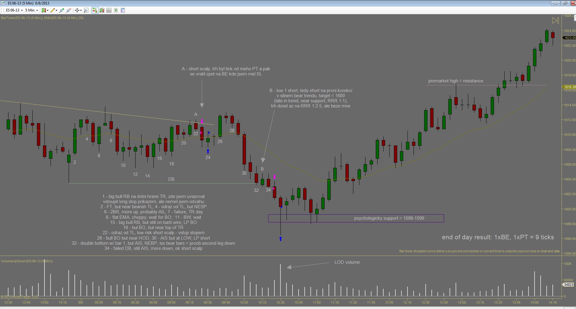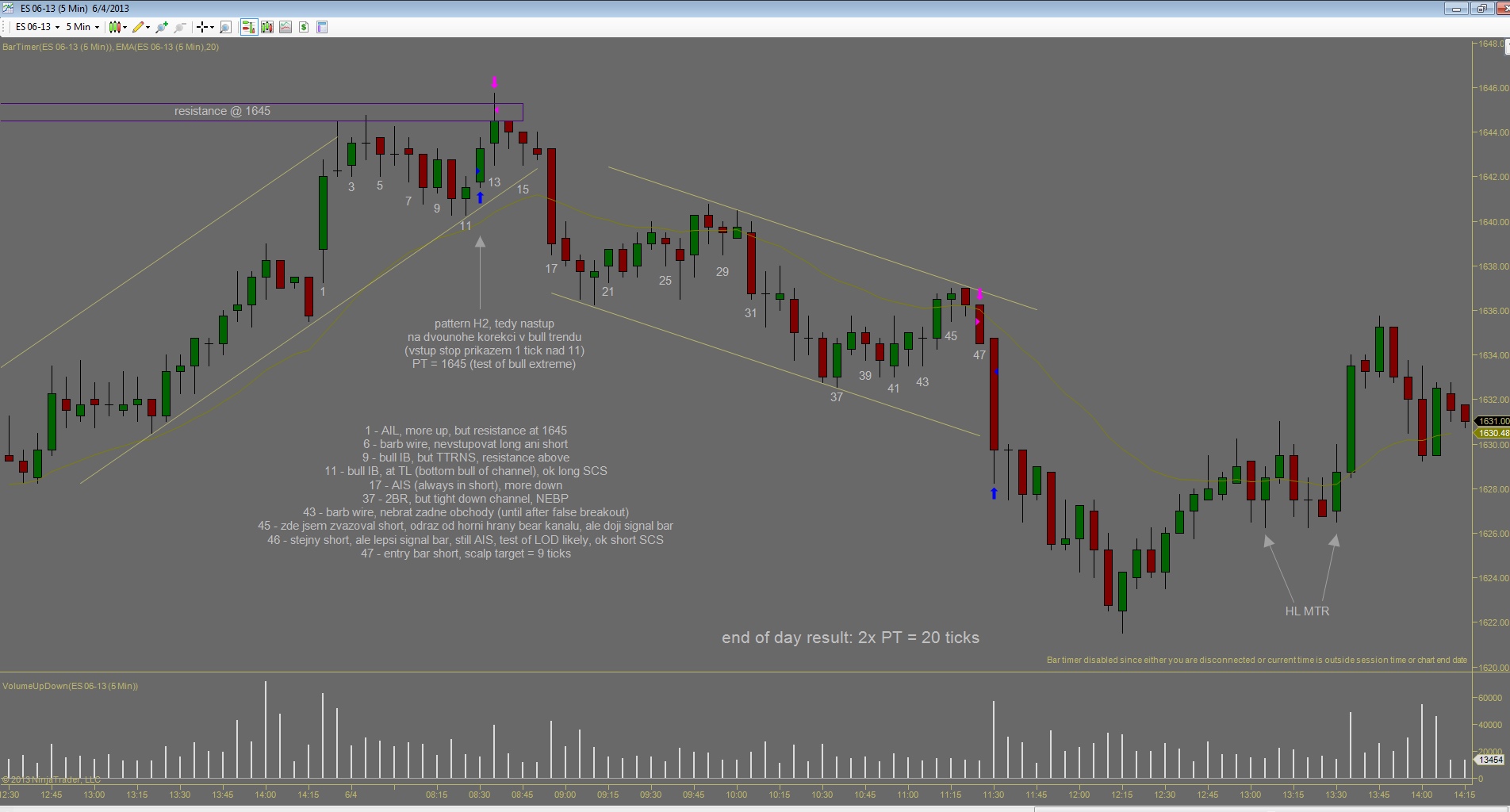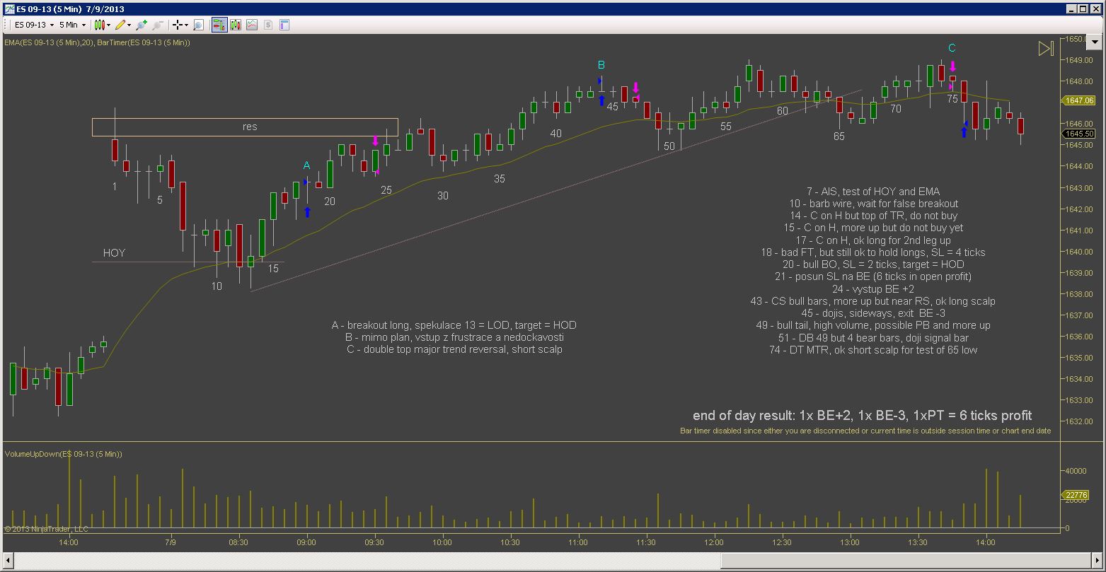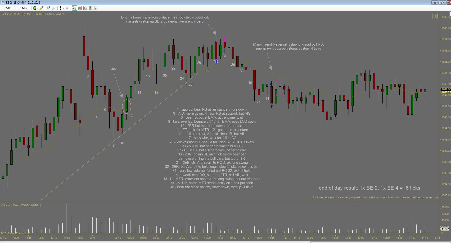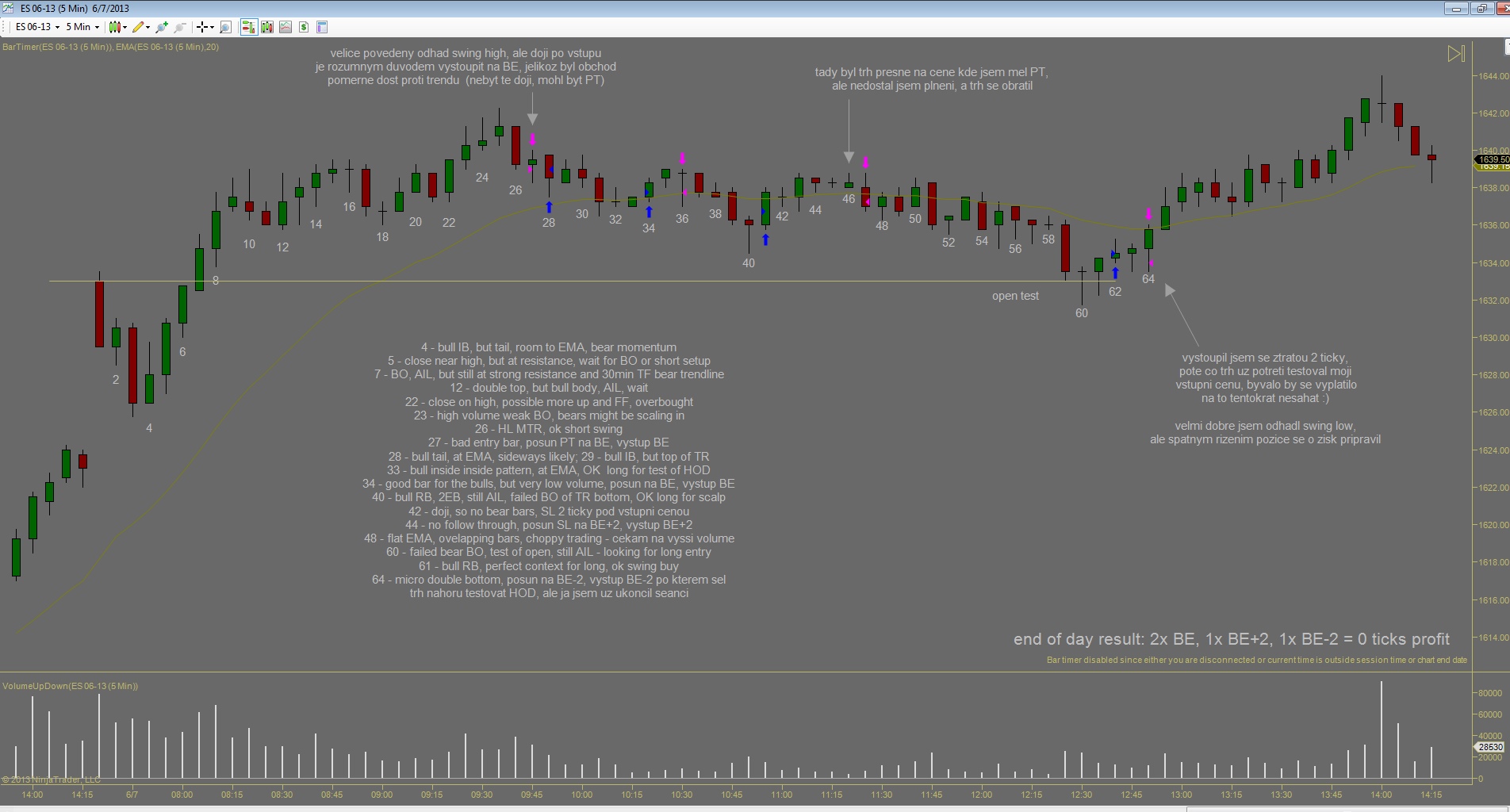 Po nekolika ziskovych dnech jsem vcelku byl pripraven, ze prijdou nejake ty ztraty. Co me tesi je ze celkova denni ztrata je mensi nez prumerny denni zisk predchoziho tydne. Kdybych to udrzel v podobnem pomeru, equity by mohla byt stabilni. Dnesek zacal patternem BDBU (big down, big up), coz ve vetsine pripadu predznamenava, ze zbytek dne bude prevazne v chopu (nejdrive velky vyprodej, nasledovan silnym uptrendem zpusobi zmatek v hlavach traderu). Prvni obchod jsem udelal proti planu, dalo by se rict implusivne, i kdyz uz to neni ta stejna impulsivnost jako v mych zacatcich, prece jsem nad tim chvili premyslel nez jsem vstoupil, ale dodatacne vidim ze to byla blbost. Druhy obchod podle me byl zalozeny na temer ucebnicovem signalu, ale trochu jsem zas experimentoval se vstupnim prikazem a misto stop buy nad barem #43 jsem sel limitem na close #44 pote co jeho high prekonal bar #45, a ten jediny tick rozhodl o vysledku. Kdybych spravne zadal stop buy, vubec bych nedostal plneni a obchod by se neuskutecnil. Za povsimnuti stoji jeste gap po obratu up na baru #11, coz je asi pro mnoho traderu neznamy jev. Gap totiz nemusi byt pouze rozdil mezi close predchoziho dne a open nasledujiciho, gapy vznikaji i behem seance...