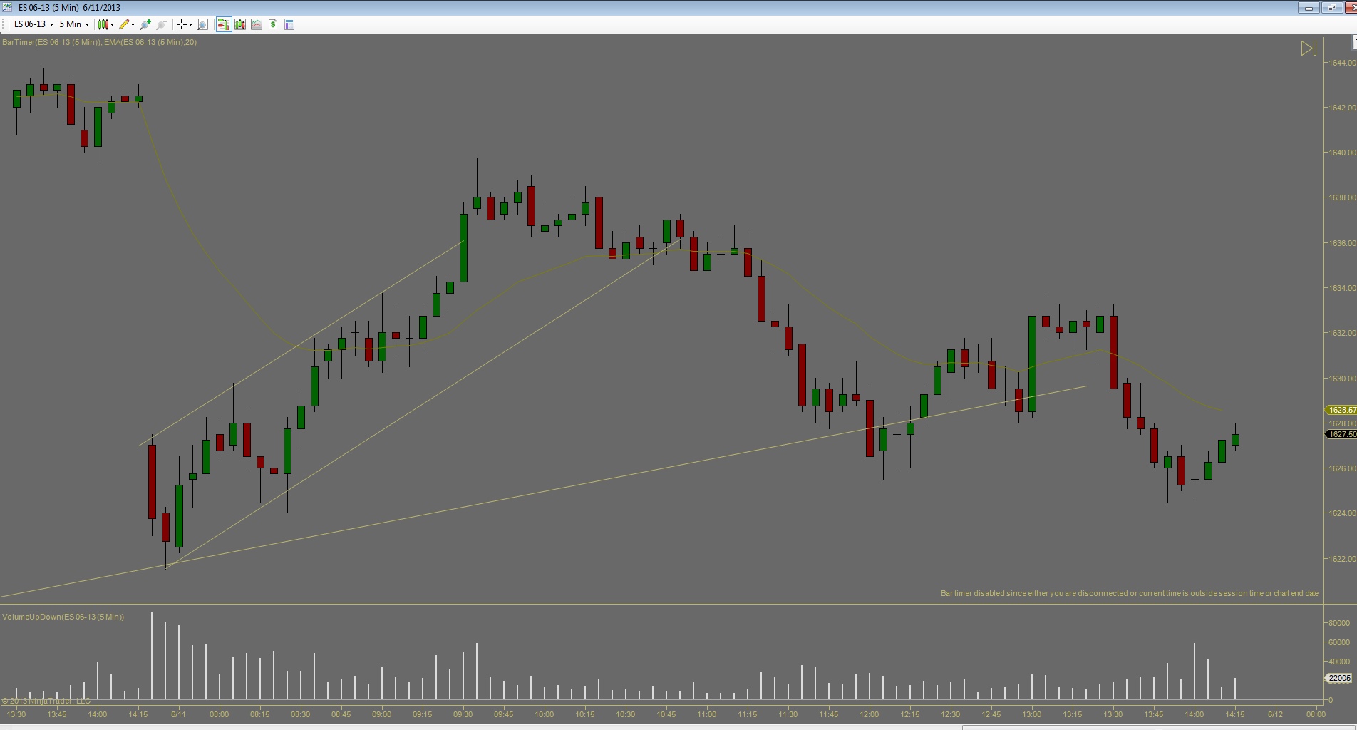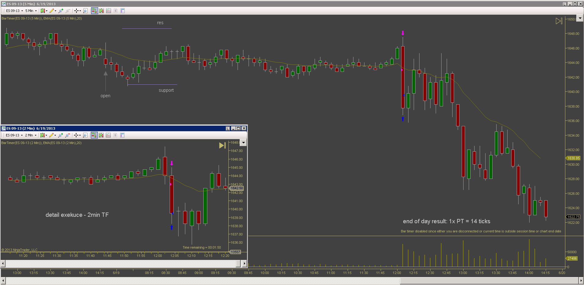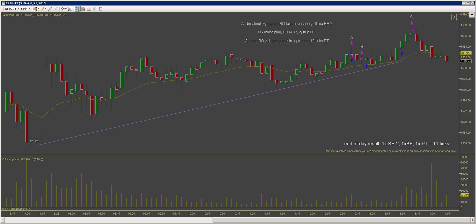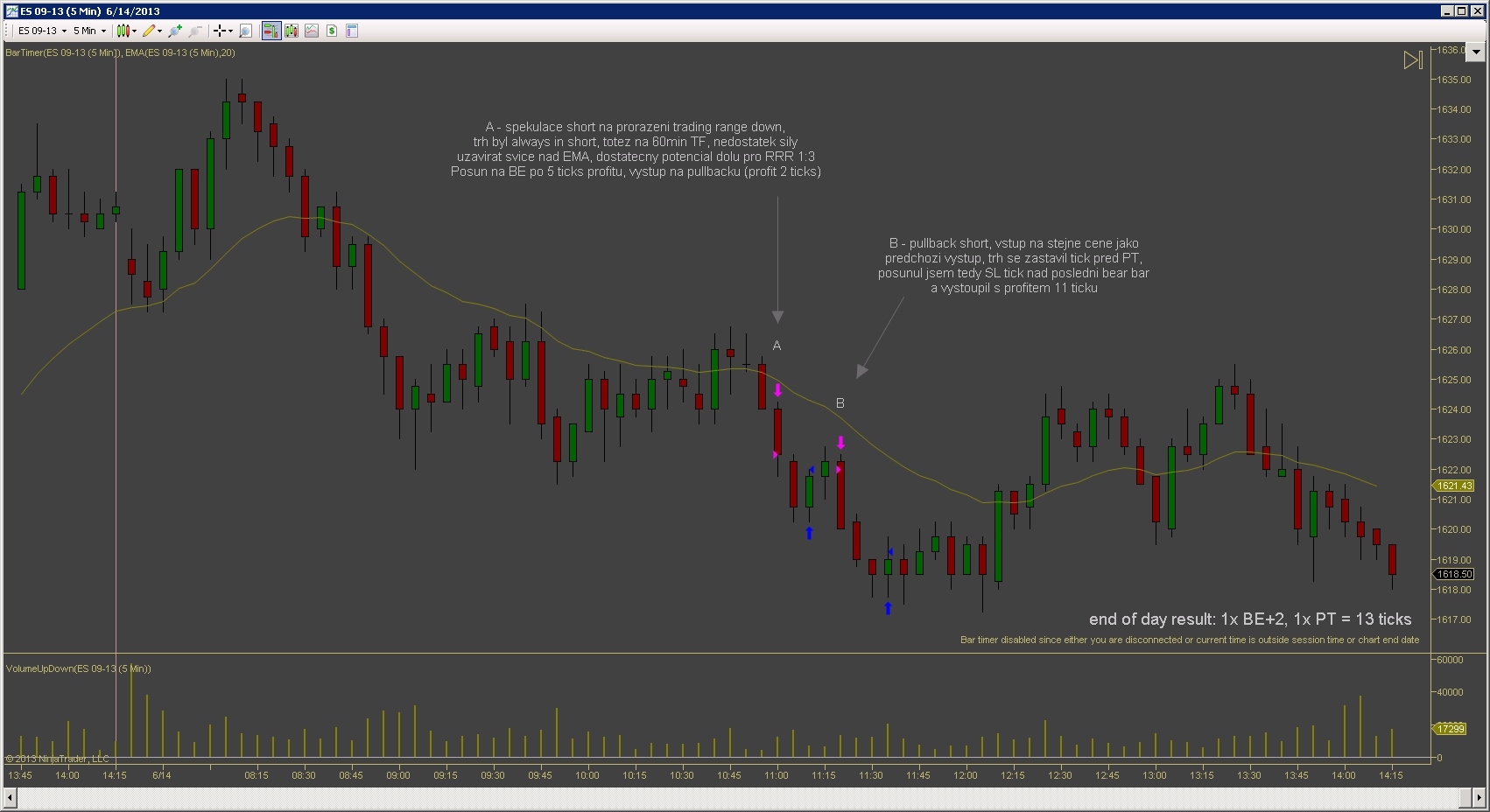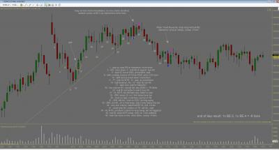 Po nekolika ziskovych dnech jsem vcelku byl pripraven, ze prijdou nejake ty ztraty. Co me tesi je ze celkova denni ztrata je mensi nez prumerny denni zisk predchoziho tydne. Kdybych to udrzel v podobnem pomeru, equity by mohla byt stabilni. Dnesek zacal patternem BDBU (big down, big up), coz ve vetsine pripadu predznamenava, ze zbytek dne bude prevazne v chopu (nejdrive velky vyprodej, nasledovan silnym uptrendem zpusobi zmatek v hlavach traderu). Prvni obchod jsem udelal proti planu, dalo by se rict implusivne, i kdyz uz to neni ta stejna impulsivnost jako v mych zacatcich, prece jsem nad tim chvili premyslel nez jsem vstoupil, ale dodatacne vidim ze to byla blbost. Druhy obchod podle me byl zalozeny na temer ucebnicovem signalu, ale trochu jsem zas experimentoval se vstupnim prikazem a misto stop buy nad barem #43 jsem sel limitem na close #44 pote co jeho high prekonal bar #45, a ten jediny tick rozhodl o vysledku. Kdybych spravne zadal stop buy, vubec bych nedostal plneni a obchod by se neuskutecnil. Za povsimnuti stoji jeste gap po obratu up na baru #11, coz je asi pro mnoho traderu neznamy jev. Gap totiz nemusi byt pouze rozdil mezi close predchoziho dne a open nasledujiciho, gapy vznikaji i behem seance...