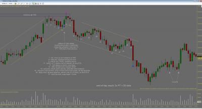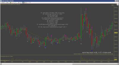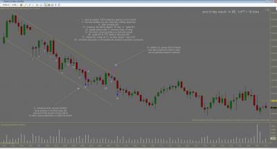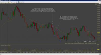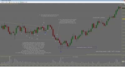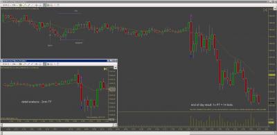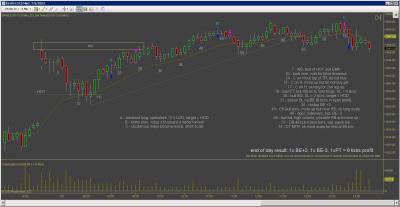 Dnes jsem inkasoval $250 na kontrakt, ve dvou obchodech. Vstupy byly pekne podle planu a jsem s nimi spokojeny. Skoda ze nemam zatim otestovanou nejakou dokonalejsi vystupni strategii, protoze trh nabidl pri stejnych vstupech profit podstatne vetsi, dalo se zarobit $1000 na kontrakt i vice (tu) Ke konci dne trh jeste vytvoril dva solidni signaly major trend reversal (higher low), ale to uz jsem nesledoval.