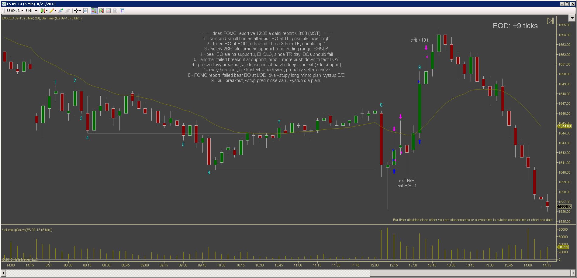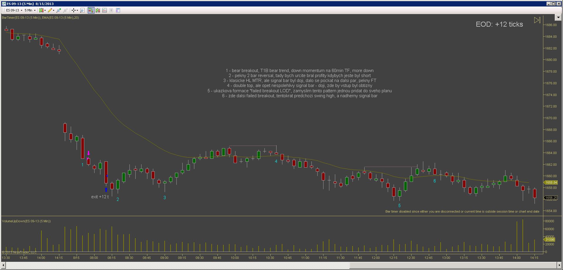 Pondeli 5.8.2013 - prvni vstup jsem moc nezvladl. Vetsinou se snazim v prvni pul hodine nevstupovat vubec, ledaze by se vykreslil pattern T1B tedy trend od prvniho baru, coz se mi v dobe vstupu jevilo (T1B bear). Nevzal jsem ovsem v uvahu maly detail, ze se prvni tri svice prilis prekryvaji na to aby se to dalo za platny T1B povazovat. Druhy vstup byl dobry, ale stanovil jsem si prilis velky PT, castectne pod tlakem emoce z prvniho obchodu (snaha dohnat ztratu - plny SL coz u me nebyva az tak casto). Trh se otocil presne na all time high, 2 ticky od meho PT. Mel jsem to zavrit na prvnim naznaku obratu, ale veril jsem ze to high aspon o kousek prorazi, momentum bylo silne. Ani treti obchod nevysel tak jak jsem ho planoval, opet chybelo jen nekolik ticku k memu PT. Celkem tedy -$50 coz je akceptovatelna denni ztrata.