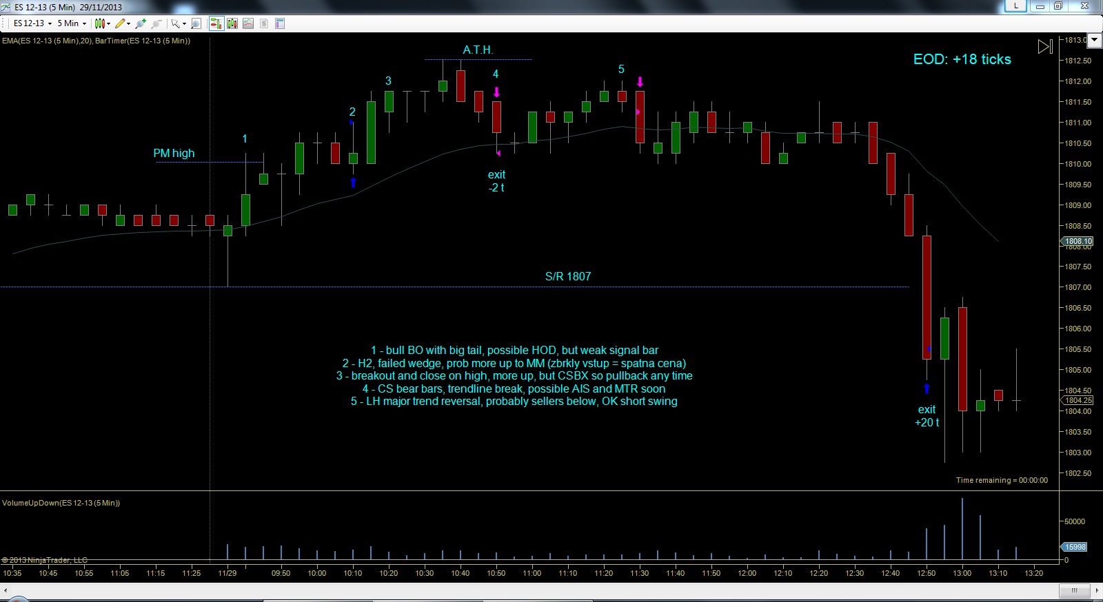 Dale pises o netrpelivosti, tak s tim se naprosto ztotoznuju, bohuzel me trapi stejny problem. Stale to je u me opakujici se situace, kdy do neceho vlezu a s odstupem casu pak ani poradne nechapu proc jsem to vubec bral. Uvedomuju si ze stale prilis malo durazu kladu na vyssi timeframe, a ackoliv nechi obchodovat pouze podle S/R jako treba FIMS, chci zacit postupne hledat Brooksovy patterny na 60min TF, pripadne na 15min, a teprve na zaklade nich hledat vstupni patterny na 5min TF. Ostatne az jednou zacnu live tak nejspis to bude uplne jiny trh nez co jedu ted (ES), a nejspis vetsi timeframe, jelikoz jinak si to pri praci nedovedu predstavit. Duvod proc ted jedu ES a na 5min timeframe je prosty, tohle je to co Brooks dava kazdy den na web, tak si to chci porovnavat a tim se ucit.