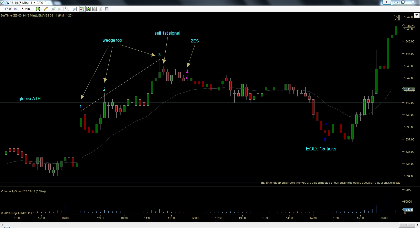 Dnes se konal masivni vyprodej akcii v dusledku ocekavanych "earning reports" ktere se tento tyden budou vyhlasovat a ktere mozna povedou k dalsimu propadu cen (soudruzi uz tusi ze vysledky z posledniho kvartalu 2013 budou stat za prd). Vse zacalo jiz v patek, kdy po job reportu ES vytvoril ukazkovou formaci wedge presne na resistanci (proto davam screen trochu posunuty do predchoziho dne). Dnes po open dalsi wedge, v mensi variante, ovsem se slabsim signal barem (6), diky cemuz jsem pattern nebral a cekal na dalsi vyvoj. Pomalu se to rozjelo a naskocil jsem na L2, vzal 150 dolaru na LOD a skoncil. Netusil jsem ze se v klidu dalo jit pro profit pres 1000 dolaru, obzvlaste pote co se trh sunul dva tydny prakticky vyhradne do strany.... (td) .