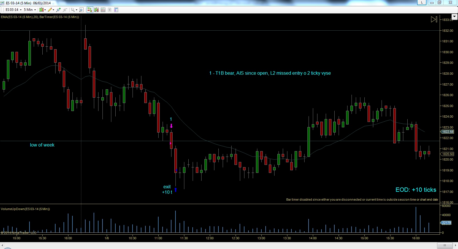 po dlhsom case stravenym vyberom brokera som spat, vynechal som dva tyzdne historie a obchodujem -1 den. po dvoch bear dnoch prisiel dnes silny bull na zaciatku dna a na zaciatku mojho tradingu som cakal, ze pride dalsi rast a otestuje sa vcerajsie high. mal som nastaveny stop buy nad prvym vyznacenym micro res ale trh vytvorili sa lower high, ktore boli viackrat testovane. najtazsie bolo vnutorne sa "prestavit" a ist do short pozicie. nevedel kam trh pojde, tak som zobral 3bodovy PT. planoval som ist potom long, ale nakoniec som sa uspokojil s profitom, znovu psychika, ale celkovo spokojnost