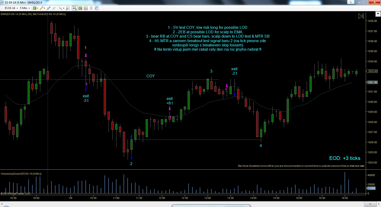 Byl to long, ale nemelo to hlavu ani patu :) Vypadalo to ze trh jen testuje vcerejsi close a momentum down bylo slabsi, tak jsem zkousel limit na COY se stopem 3 ticky, mel bych se takovych experimentu uplne vyvarovat. Long nemel cenu v tom kontextu jinak nez limitem, a v takovy situaci je zase marny cekat na signal bar. Lepsi vubec tohle nezkouset, a kdyz uz tak prave jen s vyrazne nizsim S/L