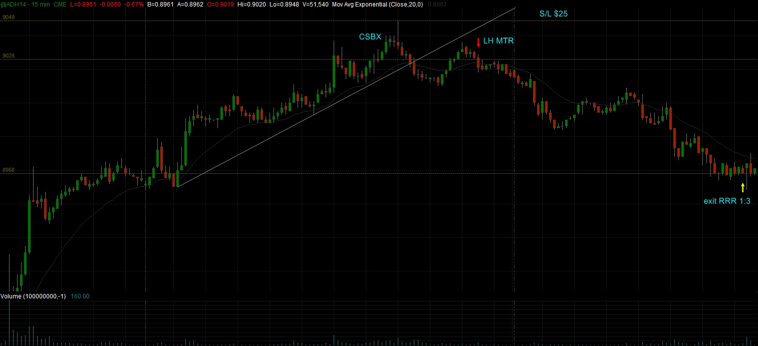 Jeste screen z dnesniho obchodu v Tradestation na zivych datech, provedl jsem ho na trhu M6A (futures na australsky dolar) kde je hodnota ticku 1 dolar, analyzu delam ale na symbolu AD, ktery 99% koreluje a ma lepe citelnou price action diky vyssi likvidite. Nicmene likvidita na M6A je dostatecna na vstupy s 1 kontraktem limitnim prikazem pri timeframe15 minut. Obchod bezel pres noc, celkem cca 17 hodin. Tento styl obchodovani jsem praktikoval jiz pred jistou dobou a musim rict ze mi vyhovuje podstatne lepe nez intraday trading. Vice casu na rozmyslenou, spolehlivejsi signaly, pritom celkove mensi risk na obchod nez pri obchodovani akciovych indexu. Muzu jen doporucit, pokud nekdo chce zkusit jiny pristup. .