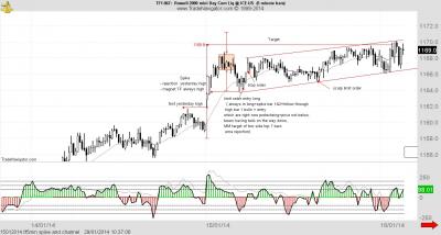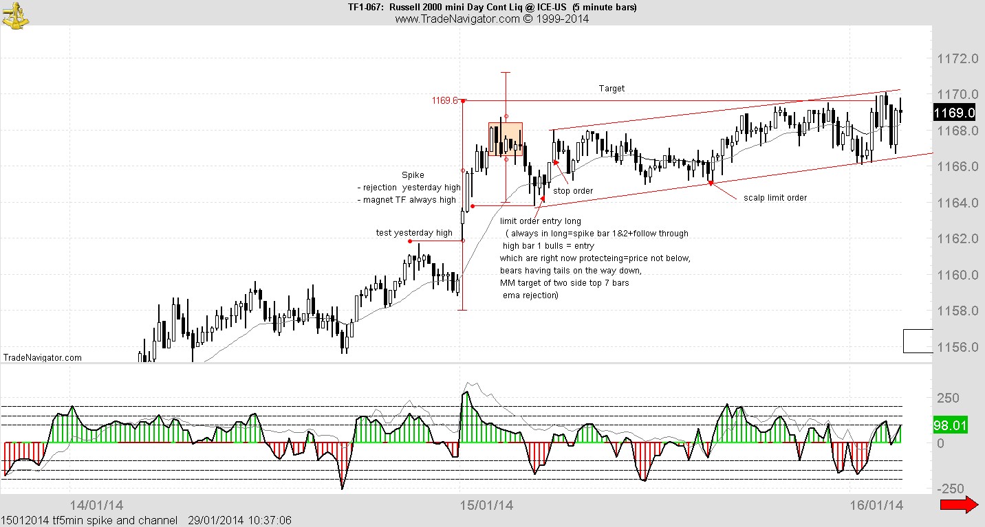 Rad bych se pripojil ke komentovani price action s allbrook vykladem dejvO: prispevek Jan 16 2014 a graf ktery 5 min, tak jeden vstup tam byl, ktery allbrooks bere a ma dobrou pravdepodobnost uspesnosti a jeste lepsi R/R pokud se vstoupi na limit order (coz mimochodem albrook dela v 90 % ale vstupy na zivo komentuje ke stop order, kdyz jsem nad tim premyslel tak to jinak asi nejde kdyz neco komentujete zive tak prece jen se musite o neco oprit jako napr close 5 min) K tomu grafu: Spike and channel (vetsinu co vim je od allbrook, takze si odpustim neustale rikat allbrook a grafy jsou posunuty 1 hr, protoze bydlim v uk)