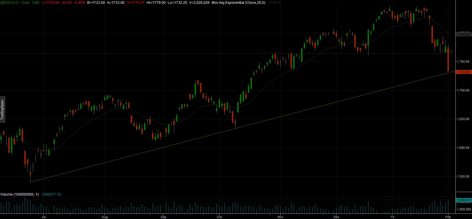 Dneska se dockali ti kdo predpovidali ze se podivame trochu vic dolu. Vzal jsem short az po reportu a opatrne vylezl na profitu $125 - na screenu to vypada jako nic, ale to je mi vcelku jedno. Do obchodu jsem sel s umyslem scalpovat a to jsem taky provedl, vysledek je tedy uspokojivy. Profit mohl byt sice patnactkrat vetsi, ale to se stava jednou za dva roky, nema cenu se tim trapit. Dale jsem trh uz sledoval jen napul, ale zakreslil jsem do screenu jeste par zajimavejch malickosti. Napriklad measured move a vyber profitu na teto urovni (tails, micro double bottom). Pozdeji odpoledne pak trh nemel silu ani otestovat EMA, natoz vytvorit EMA gap bar na pripadny dalsi short, takze jsem tusil ze to bulls vzdavaji. Ale zitra by to mohlo byt presne naopak, prikladam screen daily grafu, jsme presne na major trendline, takze do shortu bych se moc nehrnul (tu) .