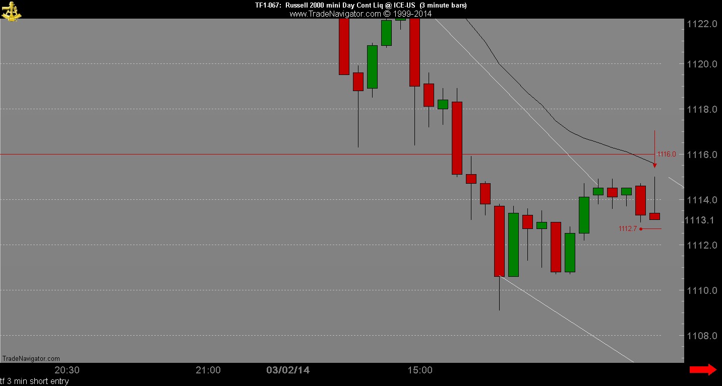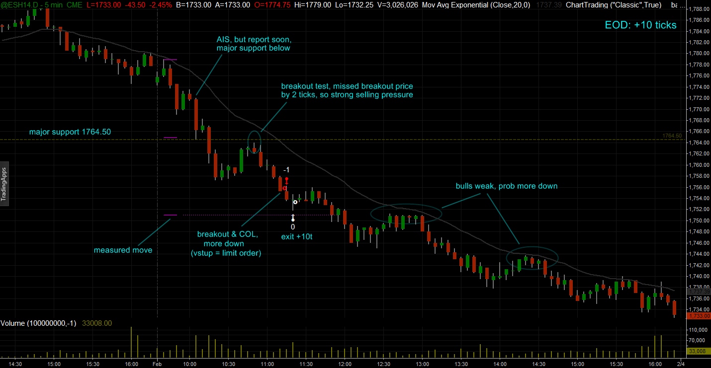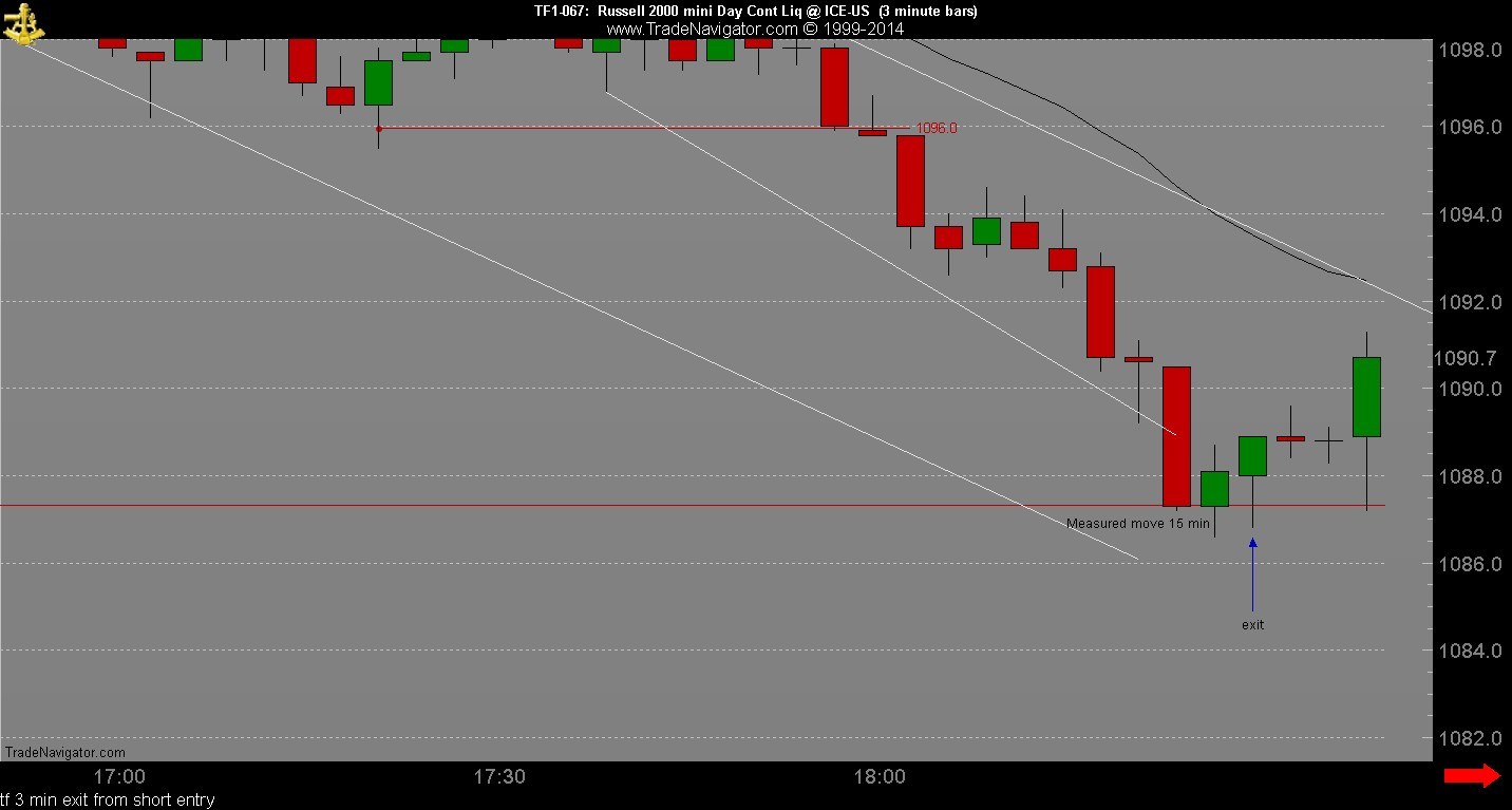 Ja jsem to malem zmeskal :) Jit do long bych potreboval nejakou korekci a v kazdem pripade videt rozjety bul higher low, kdyz jsem k tomu sedl tak 15 min breakout, vypadal silne na MM V takovych obchodech se divam i na TF s time frame 3 min a koukam po necem co by me presvedcilo morgage my account :) 1554 (london time) 1112.7 price 3 min tfbear doji, ktera sla 1 tick above 4 previous bar with closing on its low, testing a ema and making a gap good enough for me = 4 contract short risk 250 $ per position Nejprve jsem sel na scalp previous 2 sided test low ale 1606 big BO bear bar closing on its low a nasledne dalsi bars closing below me prinutili zustat v trhu + silny pruraz and basicly bulls nowhere near :) nasledne to proste padalo a padalo :) hledel jsem na MM targets a ema gap test abych vzal profit, ale poprve se to dotklo ema az 1736 a to byla jenom doji, takze jsem hledel na profit taking bull reversal 1724 price okolo 1096, ale to slo taky dolu, takze jsem nakonec po vsech moznych MM`s cekal na 15 min MM of previous 2 sided coz bylo tested s velkou bear bar closing on its low a videl jsem to jako exhaust, wedge a parabolic pote nasledovala bull bar 1087.5 jsem uzavrel vsechny pozice.
