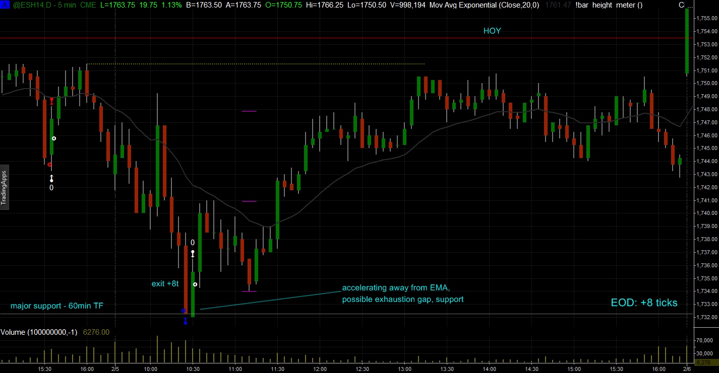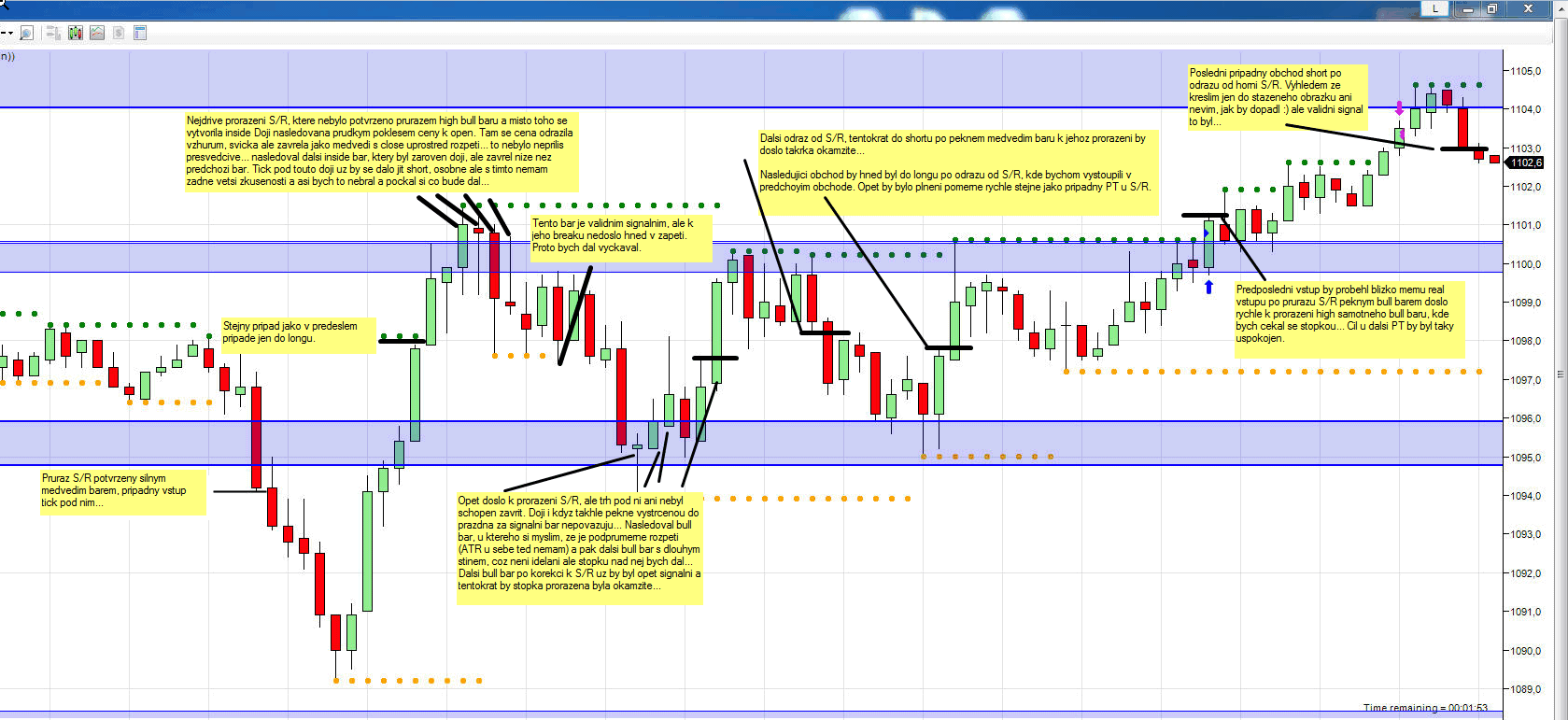 a-friend Napsal: -------------------- > skoro mi to prijde Detroit, ze se branis cteni All Brooks serii 3 knizek Naopak, me ty knizky velmi zajimaji, vim ze jsou urcite kvalitnejsi nez ta prvni (kterou skutecne zmrvili a je narocna uz jen svym usporadanim). Jde spis o to ze casu je malo a hodnotnejsi mi prijde prace se zivym trhem, papertrading a porovnani vysledku s vudcem :) Davam vcerejsi screen, byl to hodne agresivni scalp - pred timto typem vstupu Al varuje vsechny zacatecniky, je to jen na zaklade struktury a de facto bez signal baru, resp. signal bar zde je prave zmineny exhaustion gap, ktery se vykresili vcera na dulezitem supportu, takze jsem vsadil na BO failure se SL 4 ticky a PT 8 ticks, coz je vynikajici traders equation (pravdepodobnost byla na klasicky scalp prilis nizka, zato dvakrat vetsi RRR nez u high probability scalps, takze rozumna matematika...). Zapracovane do planu to zatim nemam, ale vyhledove mam v umyslu obchodovat breakouty dvema ruznymi zpusoby. Jednak do trendu - vsadit na follow thru, a jednak protitrendove v situacich jako zde, kdy se trh prilis utrhne a pravdepodobnost pokracovani stejnym smerem je tak mala, ze dava smysl vsadit na vyber profitu v podobe pullbacku (zde se trend otocil zcela, ale to clovek nemohl tusit). Vyhodnocovat budu oba typy vstupu samostatne, nema cenu delat statistiky pro oba najednou. Mimochodem - dnes to vypada zajimave. Trh mi ujel, vstup mel smysl podle me hlavne na prvnim baru, ale to zase ja nerad, takze potom uz bylo pozde a myslim ze zbytek dne budem mit jen trading range... .