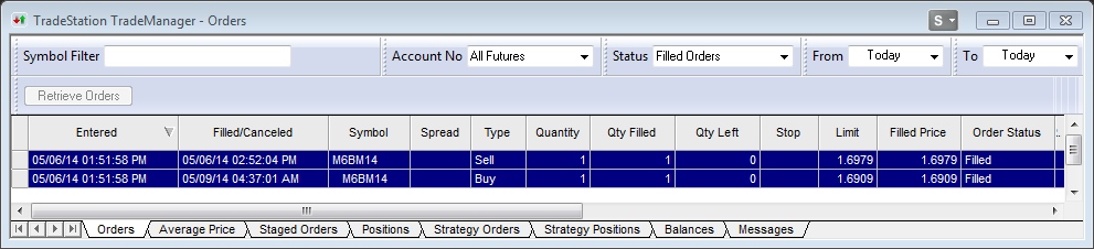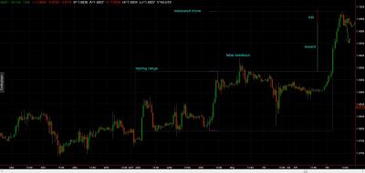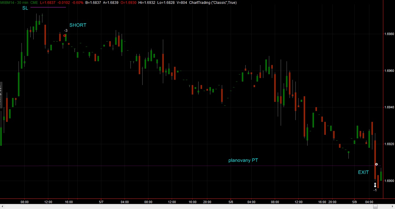 Jeste davam screeny jednoho shortu co jsem ted vychytal na GBP futures. Muj oblibeny measured move funguje na vetsine trhu a timeframe, umoznuje vstup bez signal baru jen na zaklade planovaneho RRR. Analyza na "velkem" BP a vstup na M6B na kterem je videt exekuce. Risk byl 20 dolaru, profit 70 dolaru. Idealni obchodni styl pro zacatecniky. Chce to trochu trpelivost, protoze trvalo skoro tri dny nez cena doklesala na planovanej target, ale to je spis prave dobre, ze u toho clovek nemuze sedet a nervovat se na kazdym ticku jako u intraday (tim nerikam ze by se clovek mel nervovat u libovolneho obchodniho stylu, ale priznejme si ze to tak byva). Pro vsudypritomne odpurce micro-futures prikladam screen z trade manageru - vstup i vystup limit s nulovym slipem (zde SIM, ale mam to odzkousene na live). Ano, na SL slip byva 1-2 ticky, ale opravdu na tom zalezi kdyz mame 70 ticku profit? Jeste nutno dodat ze trh pokracoval dale na jih a mohl jsem s teoretickym druhym kontraktem jit pro RRR 1:6 temer bez pullbacku (tu)