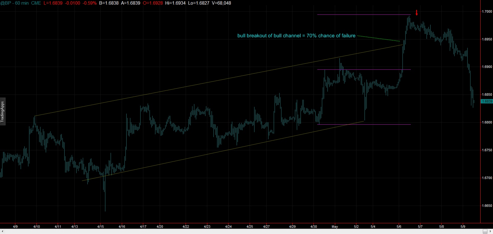 Even though the market is in a trading range, traders should look for scalps only in the direction of the trend, which means they should look for shorts.