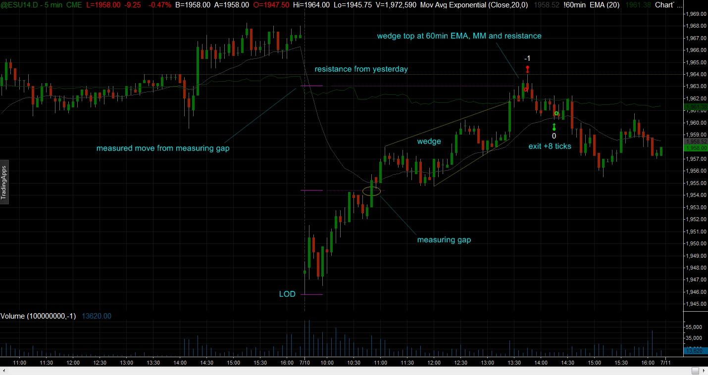 nick: Davam priklad takoveho scalpu, dnes jsem to zobchodoval sam pro 8 ticks profitu (na ES to je $100). Jeste jsem udelal druhej screen s ukazkou jak by to bylo presne podle Brookse, ja to jedu trochu jinak. Mam radsi limit orders a vstup s malou slevou, pak je vetsi sance ze dostanu fill na vystupu protoze instituce pujdou presne pro tech 8 ticku a bude tam na ty cene "fronta u kasy". Je to pekne videt ze medvedi co ten wedge scalpovali brooksovou metodou (coz je mnoho instituci), zrejme na tech 8 ticks dnes ani nedostali plneni, protoze obvykle cena musi limit order o tick preobchodvat, aby dostali fill. Ja jsem sice vstoupil o par ticku levneji (na vyssi cene) ale zas jsem sel puvodne pro 9 ticku, kam trh na tick dosel ale taky jsem nedostal plneni a hned to slo zas nahoru :) Tak jsem PT o tick snizil a jeste si peknou chvili pockal nez me to konecne vyplnilo. Byly to trochu nervy (live) ale mel jsem uz posunuto na B/E takze o moc neslo. A ze se dalo jit pro 20 ticku? Ano, ale to by byl swing s pravdepodobnosti kolem 40% a to neni nic pro me, inkasovat ve vetsine obchodu ztraty, prestoze to je profitabilni dlouhodobe a Brooks to jednoznacne zacatecnikum doporucuje (zapomenout na scalpy a soustredit se vyhradne na swingy). Kdyz uz jsem v tom tak davam jeste detail toho measuring gapu, kdyby to jeste stale nekomu nebylo jasny o co se tam jedna. Snad to z toho zvetsenyho screenu dava smysl. Measuring gap je dulezitej koncept kterej je dobrej mit v oku ;)