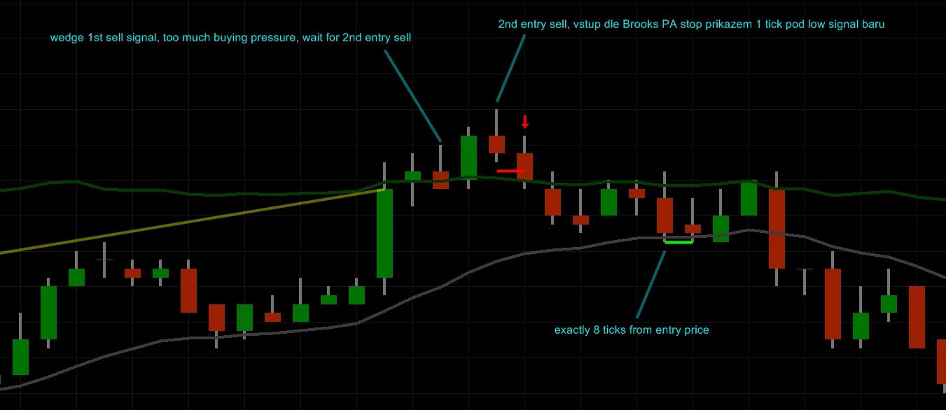 Ted jen v rychlosti, jdu si totiz ven zabehat (pricemz posloucham zaznamy z brooks trading room, odkud tyhle detaily prave mam pochyceny). Samozrejme ze mohli vlezt drive a taky ze vlezli, jinak by trh sel dal nahoru, coz nesel :) Ale to jsou typy obchodu kde je velmi nizka pravdepodobnost, nizkej risk, a velkej reward. Kdo prodava na dennim high? Prave nekdo jinej nez ty instituce co chodi pro tyhle targety. Pak teprv kdyz se vykresli rozumnej signal bar tak pod nim do tech shortu naskakaj ostatni a pokud scalpujou tak vetsinou pro 8 ticku a pro swing vetsinou pro 16 ticku. Jak to vim? No staci sledovat pozorne price action na ES a zacnes po case videt veci ktery ti vyrazi dech. Nejvic je to poznat prave na tech swing obchodech, ES ma skutecne vysoky tendence zpomalit, nebo se odrazit po 17 tickach od rozumnyho signal baru treba na LOD nebo HOD (16 ticks na profit a 1 tick aby cena projela ty limit orders a vyplnila je). Mohl bych dat nejaky dalsi screeny, a nebo vrele doporucuju koupit si aspon mesic archivniho brooks trading room, kde o tom casto mluvi a uvidis primo ukazky nazivo. Kolikrat jsou videt i scalpy pro 4 ticky kdyz opravdu davas pozor a sledujes kazdej tick. Na vytistenym screenu bys ty 4-tickovy nevidel, tam uvidis hlavne swingy, ktery jsou vetsinou tech 16 ticku kdyz spravne identifikujes vstupni cenu na zaklade signal baru kde vetsina algoritmu do trhu vlezla. Ostatne od toho ma Brooks pojmy jako 5 tick failure, 17 tick failure apod... muzes nastudovat v knizkach napriklad. Taky na jeho free webu se o tomhle casto najde zminka jak se trh otocil presne po 8 nebo 16 ticks apod.