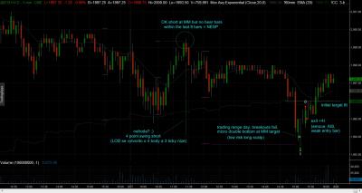 nick Napsal: ------------------------------------------------------- > zaujalo me tech 8 ticku, pro ktere sli podle tebe > instituce. jak tohle muzes vedet? i kdyby sli, > proc by do toho nemohli vlezt o tick driv/pozdeji. Zdar nick a ostatni, jsem zpatky doma a uz jsem udelal zase par obchodu. Dneska dve velmi zajimave situace. Prvni obchod kterej jsem nevzal, se nakonec ukazal jako jedinej swing celyho dne a je nadhernou ukazkou toho o cem jsme zde mluvili pred mesicem, s tim 2 point a 4 point profit targetem. Pokusil jsem se to tam zakreslit jak nejlip to slo, signal v 11:25 (EST) coz byl ten bear bar po osmi zelenych a doji useckach, vstup podle Brookse jeden tick pod timto barem stop prikazem. Jelikoz slo o rozumny swing a pravdepodobne high na nekolik dalsich hodin, vetsina medvedu sla pro 4 body coby standardni swing target na ES a poctive drzeli az dokud k targetu trh nedosel. Jak to vim? Na screenu je to pekne videt, jak si tam ty profity vybrali a ja jsem zaroven naskocil diky tomu na long scalp. Bohuzel jsem po dovoleny jeste trochu mimo a nevydrzel jsem to po tech dvou useckach s absenci bull body a posunul PT na 1 bod. Taky me ovlivnilo trochu to ze behem dne trh rotoval v range pouhe dva az tri ticky, coz neni ani jeden bod a tedy naprosto neobvykla price action. Mimochodem, v patek je posledni den mesice a je mozny ze se to trochu rozjede, at uz nahoru nebo dolu. Taky to muze zacit uz zitra, kazdopadne je slusna pravdepodobnost ze nebudou dalsi dve doji na daily grafu jako byly posledni 4 dny. Nechme se prekvapit... dejv0, jak jde live? Ja jsem zatim stale na kladne nule ;)