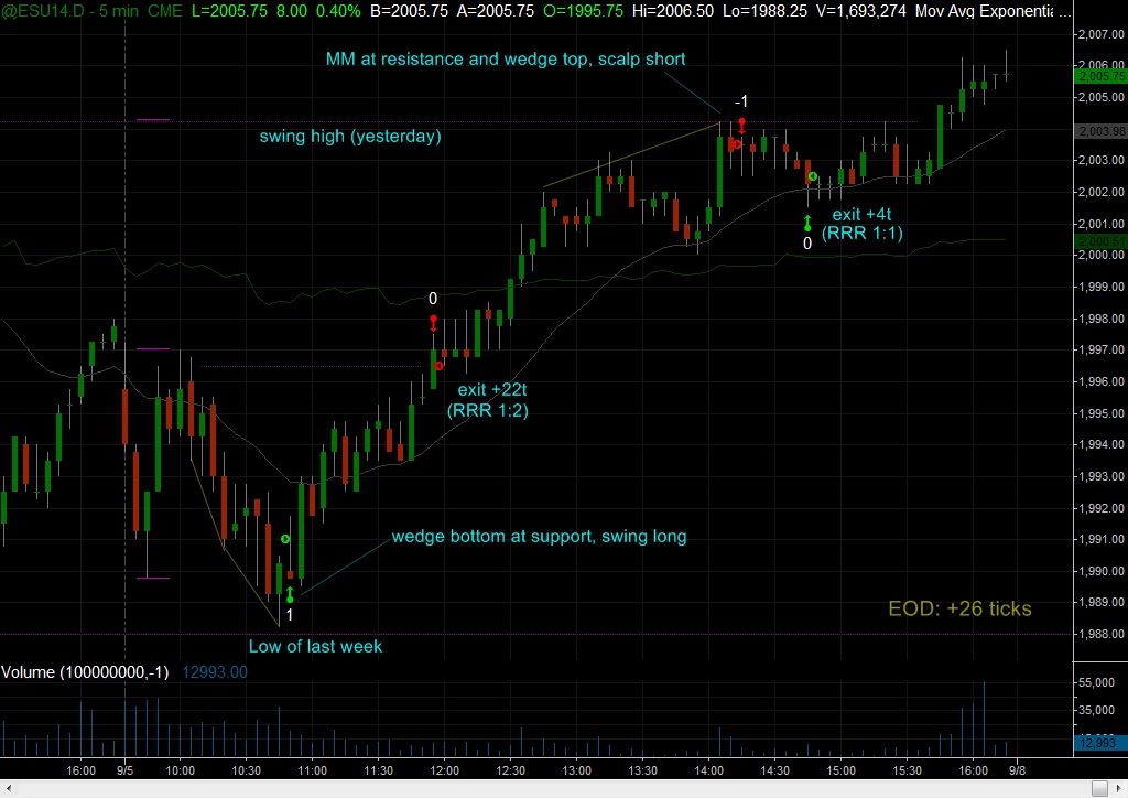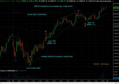 Davam screen z patku, jsou na nem oba patterny ktere ted primarne obchoduju: Wedge top / bottom, a Measured move (MM). Wedge ma nizsi pravdepodobnost a vetsi RRR, a naopak to je zase u MM, tam se da cekat jen vyber profitu a vetsinou se nevyplati chodit pro vzdalenejsi targety. V tomto pripade jsem musel i posunout PT z 8 ticks na 4 ticks, kdyz trh nevykazoval znamky obratu a take ze byl konec dne v patek, coz je velmi dulezite pro weekly chart, na kterem bulls chteli samozrejme close > open, coz se jim take na posledni chvili povedlo a maji tedy jiz patou bull candle v rade na tydennim grafu = slabost medvedu. Ten wedge jsem vsoupil o tick vyse nez bych spravne mel, jelikoz jsem byl nerozhodny po mirne ztrate z predchoziho dne. Target jsem nastavil na dvojnasobek SL, tedy prijemnych $275 (22 ticks).