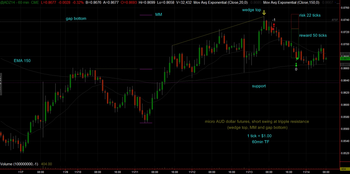 Ukazka z moji soucasne strategie.. jak jsem psal, prechazim z intraday na swing trading 60min graf, risk 0.5% uctu na obchod. Vstup a vystup limitem, bez skluzu. Jeste nemam dostestovano, ale vypada to slibne. Obchody planuju mnoho hodin dopredu a mam cas na rozmyslenou, posouzeni RRR atd. Impulzivnost uz nemusim resit :) .