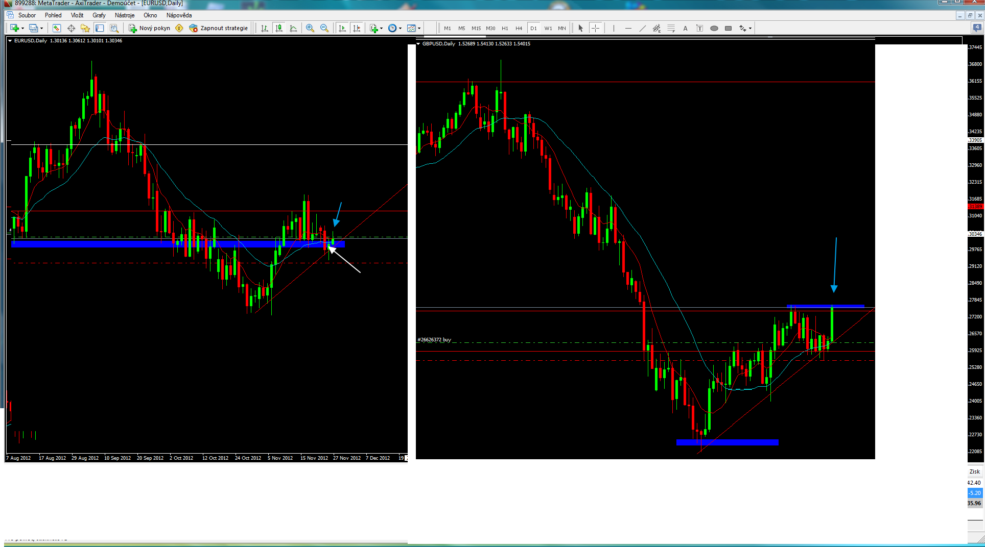 Belier: ten obchod na EURGBP je moc fajnovej, ten se Ti povedl. Mne to uniklo, protoze mi moje EMY ukazaly, ze uz by to bylo proti trendu, navic jsem tam mel jinak nakreslenou SR, takze jsem to ani poradne nezkoumal. Ted kdyz to vidim zpetne, vypada to dobre. Ten plyn je taky ok, to vypada, ze se da vzit. Plyn ja ale vubec nedelam, muj broker ho nema v nabidce. Jinak k tomu posouvani na BE. Mas pravdu, ze ten posun na BE a dalsi veci v MM zalezi hodne na konkretnim traderovi. Ja jsem se snazil ridit vzdycky tim, co Nial doporucuje pro zacinajici tradery, tzn. co nejmin to komplikovat. Mas pravdu i v tom, ze nekdy oni berou i 1,5R, ale to uz si opravdu musi kazdy sam urcit, co mu vyhovuje. Ja se snazim drzet strikniho set and forget, zjistil jsem, ze cim vic do toho saham, tim je to horsi. Jeste k te diverzifikaci a moznosti pribrat do toho dalsi strategie, hodne nad tim ted premyslim. Zkousim si ted hrat s urcityma breakoutama, zcela ve smyslu set and forget na 4H grafu a naprosto mechanicky. Cim min diskrece, tim lip. Je otazkou, jestli tyhle mechanicke veci maji budoucnost a budou dlouhodobe ziskove (viz problematika AOS). Nejsem navic programator. Zatim mi u toho co zkousim vychazi, ze by to mohlo nekam smerovat (backtest na nekolika parech plus zlato od roku 2005 doted a zhodnoceni sice nijak zavratne, ale kazdych par procent navic se pocita). Udelat pak treba 3-4 takove strategie (nekorelujici) a Niala k tomu, a pak vzdycky vecer k tomu na 20 minut sednout a zadat objednavky ve stylu set and forget. To mi prijde jako idealni zpusob. Aspon teda pro me v soucasne situaci. Otazkou je, jestli to neni moc veci naraz a jaky to ma potencial. Daytradingu na forexu se trochu bojim :-)