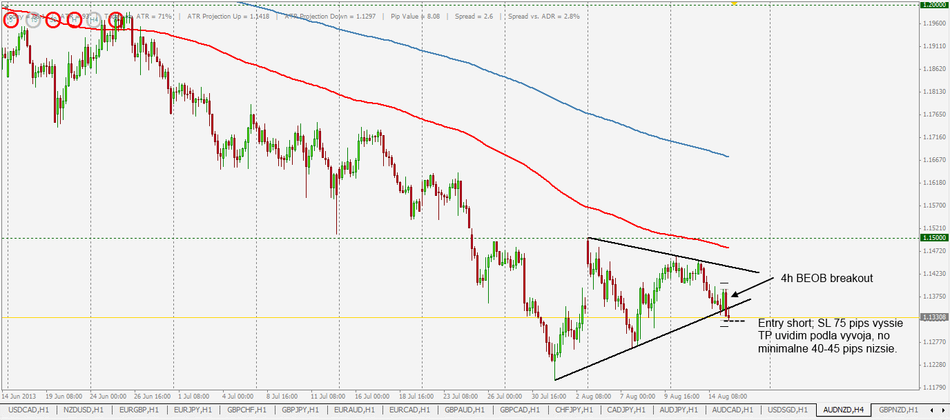 AUDCHF sa podla predpokladu bohuzial toci proti mne. Vystup na -5 pips. Zabudol som updatnut USDCAD - hoci to vyzeralo na BE, predsa len sa to pohlo spravnym smerom a ukoncil som to na +30 pips. Dnes som este pred cvhilkou vstupil do AUDNZD na 1h/4h TF short na zaklade 4h bearish outside baru,ktory prelomil triangle pattern. Viac na obrazku..