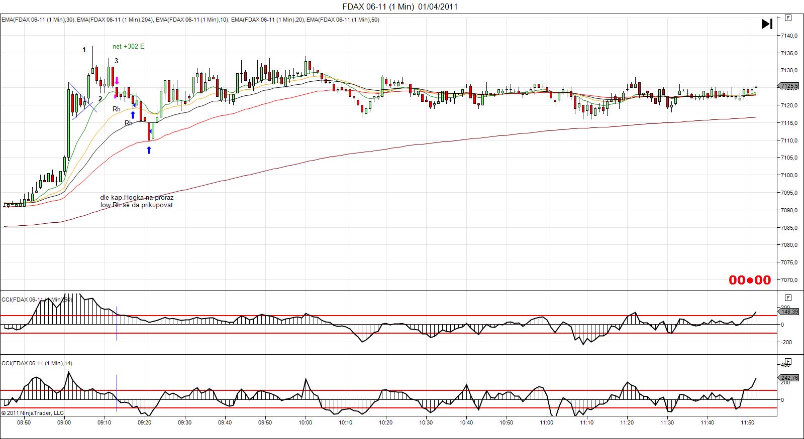 Abrams: jeste jednou dik za preposlane materialy od rosse, ktere jsem poctive studoval. Na you tube je taky dost videi. V kratkosti jsem si 1-2-3 a Rh nasel na grafech poslednich 3 tydnu a byl jsem celkem prekvapenej. ... mohl bych poprosit nejakeho zkuseneho "Rossaka" aby mi prekoukl tento vstup a okomentoval?? Je to presne to, co popisuje Ross a hlavne, jak to zobchodovat?? Dnesni sit na DAX: po dlouhy dobe jasne max, trh zformoval neco mezi 1-2-3 a DT, in po prorazeni vrcholu 2. obe PT mam fixni. Sit. na CCI jsem se neridil - dela to nejaky pravidelny signaly?? diky zdar pajus