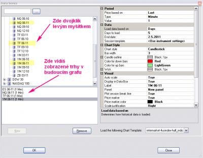 sunflower: Ahoj, stačí ti ninja trader. Když vytváříš nový graf - File - New - Chart, objeví se ti okno "Data Series" a zde poklepáním vložíš požadované trhy a kontraktní měsíce, viz obrázek. Honza