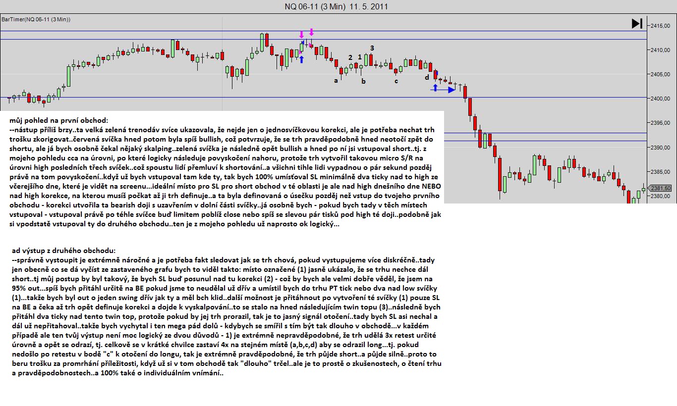 iigis: jak tu stále všichni řeší, kdo kolik vydělává a jaký přístup je nejlepší, tak já se zase pokusím přihodit něco konkrétního a ryze praktického pro inspiraci...tentokrát to je pro tebe, už jsem na to chtěl reagovat dřív, ale nějak nebyl volný čas..takže tady je můj osobní náhled na dva obchodní dny, které jsi zde prezentoval pár dní dozadu..je to celkem dlouhé, tak uvidíš jestli se ti to bude chtít číst..určitě jsi z mojeho pohledu na super cestě pokud jde o tenhle přístup...jen jsem popsal pár postřehů ke vstupům a jednou i k výstupu..třeba se něčím inspiruješ.. PS. taky bych ti rád dal jednu myšlenku na zamyšlení - možná postupem času zjistíš, že vlastně ani ty S/R z předchozích dní nejsou tak důležité, že prostě to jde dělat i tak, že prostě sleduju, co aktuálně trh dělá a jak se chová a podle toho vstupuju v logických místech na korekcích se zapojením podobného myšlení jako popisuju v těch editovaných screenech...odpadne tak ta veliká diskréčnost v určování hranic S/R zón a zůstane pouze ta diskréčnost samotného vstupování/vystupování, ale ta je přímo závislá na tom, co právě trh dělá, takže je maximálně aktuální...ono i člověk zjistí, že trh prostě zastavuje na těch S/R úrovních i bez toho, aby si je musel dopředu zkoumat a kreslit..je to prostě přirozené a lze to poznat přímo z pohybů a chování trhu v reálném čase..ale určitě jsou S/R dobré proto, aby sis ze začátku určil omezený počet míst, kde chceš vstupovat...problém je když zónu určíš špatně (otázka je právě co je špatně, když to každý kreslí jinak - odpověd ti dá pouze trh, která tvé zakreslení buď podpoří nebo vyvrátí) a chytáš jeden SL za druhým.. já dnes už používám S/R zóny spíš pro vystupování, pro umísťování vzdálenějších targetů než pro samotné vstupy..ale dlouhou dobu jsem tím strávil a určitě je to jedna z věcí, které mi hodně pomohly co se týče logiky obchodování a pochopení trhů... kdybys chtěl něco z těch mojich poznámek diskutovat, tak není problém..pokud tenhle koment teda objevíš :) majkll