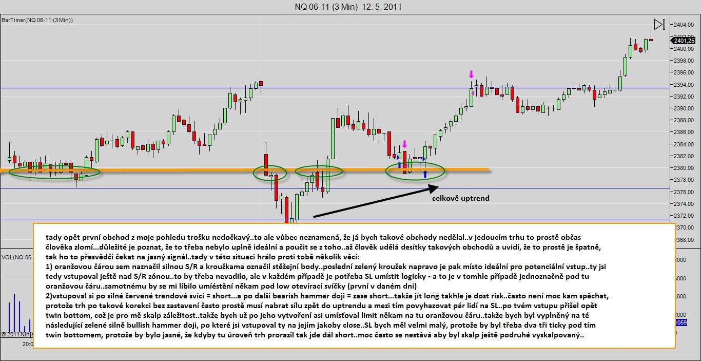 K tým výstupom tam to zatial nehávam na tých S/R z dôvodu že zo začiatku nechcem pridávať veľa premenných jednoducho je to pre mňa zatiaľ tažké posúvať PT kade tade keď začnem len s 1 kontraktom. Verím že časom prejdem na viac kontraktov a samozrejme aj viacnásobným vystupovaním no všetko to dúfam príde so skúsenostami bohužiaľ neviem odzačiatku managovať pozíciu tak ako by som si prial. Aj pri tých PT čo používam je už dosť diskrečnosti včera sa mi vyplatila chamtivosť dal som PT velmy nízko a z 11bodového otvoreného profitu (na NQ už poriadny pohyb) bolo BE. No aspoň vidím že sa je priesotor zlepšovať.