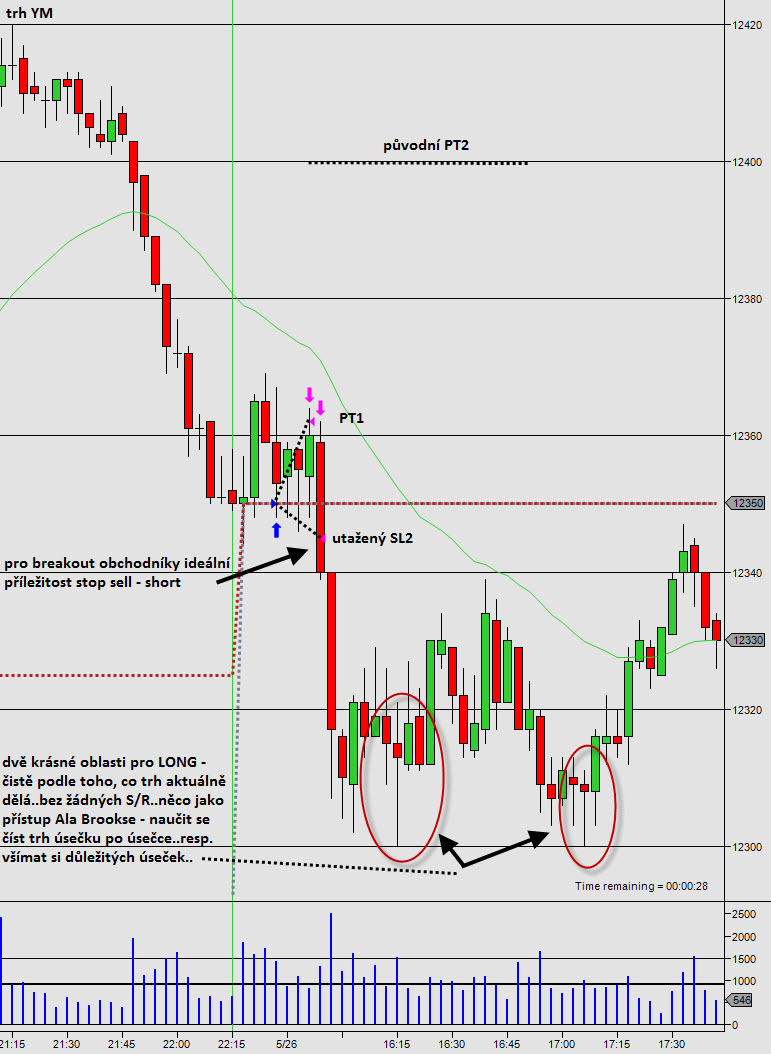 2)Zkus přitahovat SL více logicky – koukej, kam by se mohl trh vrátit, aby byl stále v původním směru vstupu a kde už to je za tou hranicí pro otočení trhu. A nad/pod tu hranici přitáhni SL. Bezduché přitahování SL na BE+1 je podle mě jedna z nejhorších věcí. Pokud má člověk inkasovat ztrátu 3 ticky nebo má skončit na nule, tak to není takový rozdíl jako rozdíl v šanci, kterou trhu dá, když nechá SL logicky přitažený a když ho násilně přitáhne na BE+1.