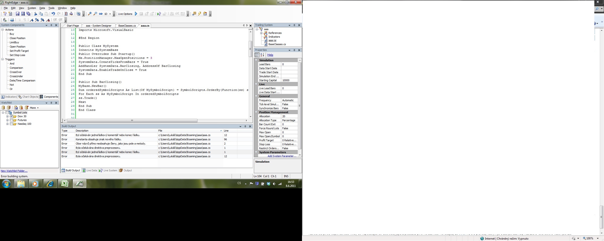 to : xzajic diky za script. Zkusil jsme to nasoukat do RIGHT eDGE TÍMTO ZPŮSOBEM: 1) vytvoril jsem novy trading system "aaa" 2) otevrel soubor aaa.cs a nakopiroval do nej tvuj script viz vyse Kdyz jsem spustil simulation tak mne vyskocily nejake chyby viz obrazek.¨ Pokud by jsi mel chvili a kouknul se na to budu vdecny. Diky Lukas
