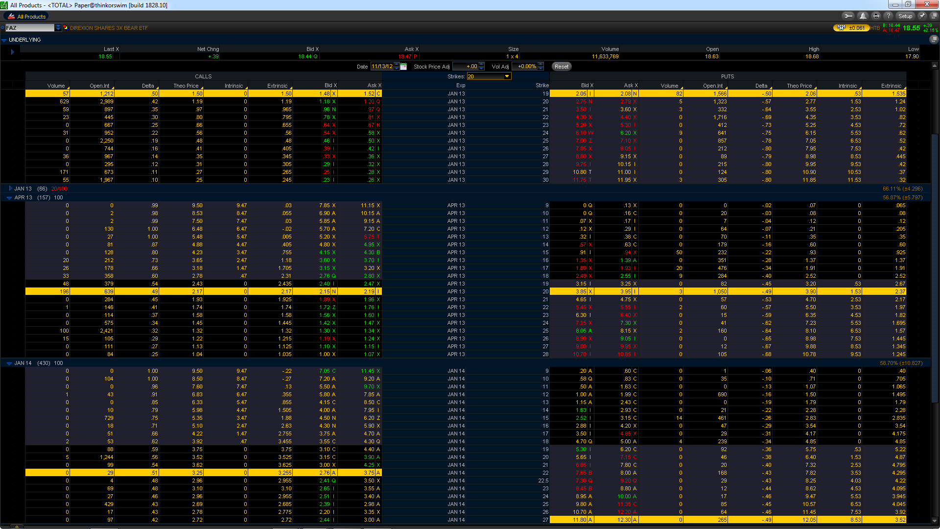 Ten FAS FAZ je fakt masáž na mozek :D Koukal jsem na opce a je na nich delta skew směrem na long!?! A to jak na FAS, tak na FAZ. S rostoucím počtem dní do expirace se vzdálenost skew navyšuje. Teď je otázka, zda-li je delta spočítána správně, nebo zda je výsledek platformy mimo stejně jako u opcí VIX versus VIX Index, kde to prostě počítá špatně. Jako zajímavost k FAS FAZ zde tuto informaci přikládám. Pokud by se tímto chtěl někdo se mnou více zabývat, přesuneme se do nového vlákna v sekci opce. Možná to má co dělat s tím matematicky zabudovaným skew na short, ale proč jsou potom delty 0.50 zobrazeny na long straně? A další věc, u klasických akcií by měly být delty při součtu na put a call straně rovny číslu 1. Zde jsme u derivátu, který se nehýbe dlouhodobě úplně standardně, zde se to jaksi rozjíždí. Dívat se na derivát derivátu indexu, to už pro mě začíná být trochu matrix :) Uvidíme, jak mi bude zítra fungovat hlava a jestli něco zjistím. Pan Google mi zatím v tomto moc nepomohl. Jakoukoli pomocnou ruku vítám :D Tom P.S. V IBčku to s deltami vypadá obdobně...