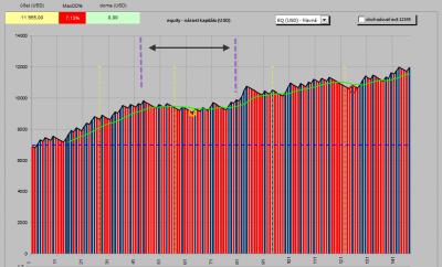 Zdravím, chtěl bych poděkovat za zajímavý článek. Také bych se ostatních chtěl zeptat, zda by nebyli ochotni uvést svoji equity s právě obdobím kde člověk neprofituje a snaží sse přečkat až na konec. Nechci rozhodně působit negativně nebo poukazovat na množství ztrát a cokoli v tomto duchu. Spíše bych se chtěl poučit a podívat jak takové problematické období celkově ovlivňuje skutečnou profitabilnost systému. Radši bych se poprvé podíval na problém na nečisto než se s ním poprvé setkal na live. Jistě spousta lidí zažila a dobře si takové období pamatuje. V každém systému se DD musí projevit mírně odlišně, proto bych chtěl zjistit, co již je problém a co je jen zbytečná nejistota. Přikládám screen mého systému kde procházel nepříjemným obdobím. Jedná se stále jen o backtest, ale jekoliž to bylo poprvé co se mi vyloženě nedařilo (na všech timeframech - které jsem zkoumal) byl jsem rozčarovaný a nepřekvapí, že brát energii do pokračování backtesů na různých TF mi dělalo potíže. Vyznačený pás začíná v půlce února a pokračuje do 3. týdne v březnu. Kdyby se někdo chtěl podělit budu rád a třeba i ostatní.