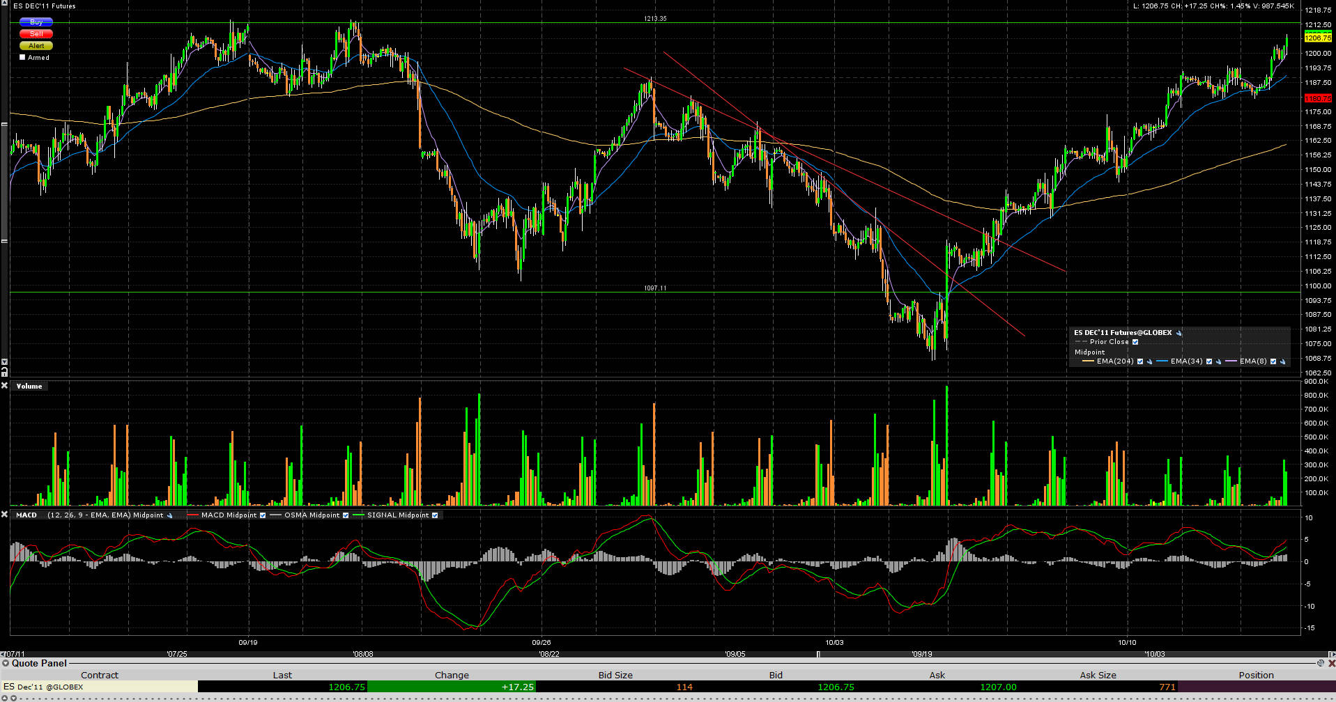 Zdravím všechny, přináším do diskuze zajímavý pohled na dění posledního týdne v ES, konkrétně na 6-ti denní UPTREND, který začal povídáním Bernankeho a zprávami o rekapitalizaci bank v EUrovalu (což včera trochu zakyslo jak všichni víme). Na grafu v příloze si hlavně si všimněte, jak se postupně pohyb nahoru vyčerpává, a dnes v premarketu došel až na zlomovou hranici 1203 (důležitá úroven rovnováhy za poslední 2 mesice), kde se potvrdila resistence. Jsem zvědavý, jestli bude mít trh sílu se nad tuto hranici dostat a jestli se tam i udrží. Pokud se podíváme na ESko z pohledu pozičního tradera, mohla by to být velmi zajímavá trade location pro vstup SHORT.