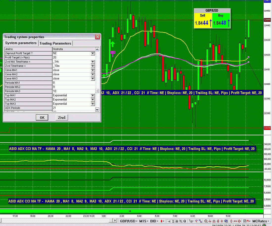nastavení, které jsem tady včera dal (koukám, že používáš verzi s posunutými Timeframe) nemusí být dogma, je to spíše jen o možném nastavení (zadal jsem jako příklad klasický Kama, ADX, CCI a tři MA postupně za sebou - 8,9,10), ale periody MA, stejně jako variace na Timeframe mohou být různé !! (třeba Timeframe 2 hod./30 min., ADX 21/14, CCI třeba 50 a MA 10,12,14 - to je opět pouze příklad !!)...předpokládá se i vlastní iniciativa...:-), AOS ti vypne za určité podmínky sám nebo to po určitém zisku/ztrátě můžeš vypnout ručně nebo používat předprogramované časové rámce, SL,TSL a TP - jak říkají bratři Slováci (a moc se mi to líbí) - možností je neurekom...:-)