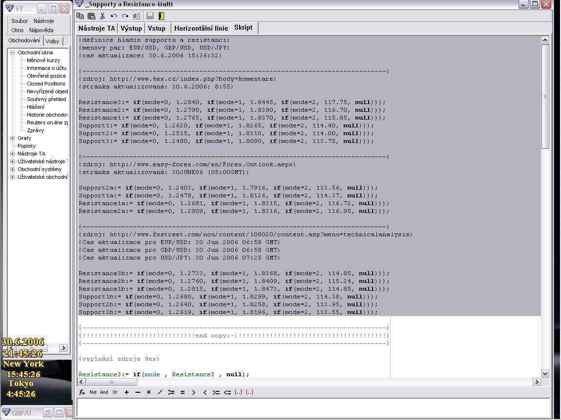 Standby: Celý obsah textového souboru, který se vygeneruje, (pro dnešní den má tento soubor název: 30.6.2006_Supporty_a_resistance.txt) překopíruješ přímo do skriptu. Nejlépe přímo z grafu přes volbu: "edituj nástroj TA", dále záložka "skript". Tam označíš celý neaktuální text (S/R z předchozího obchodního dne) a tento text smažeš a místo něho zkopíruješ aktuální text z vygenerovaného textového souboru. Nejefektivnější je takto označený text přepsat pomocí klávesových zkratek ctrl+c, ctrl+v. Aby jsi neodmazal něco důležitého, mám tam značku "end copy", po kterou text označuješ(přepisuješ). Přikládám obrázek, dle kterého by měl být vše jasný.